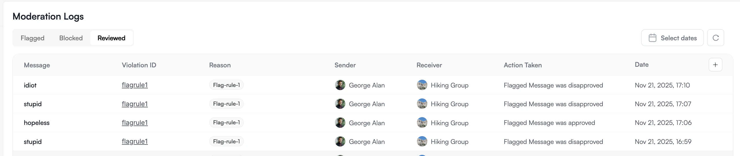 Reviewed Messages is your audit trail for all moderation decisions. When a moderator takes action on a flagged or blocked message (approve, block, or mark as reviewed), it automatically moves here for record-keeping.Documentation Index