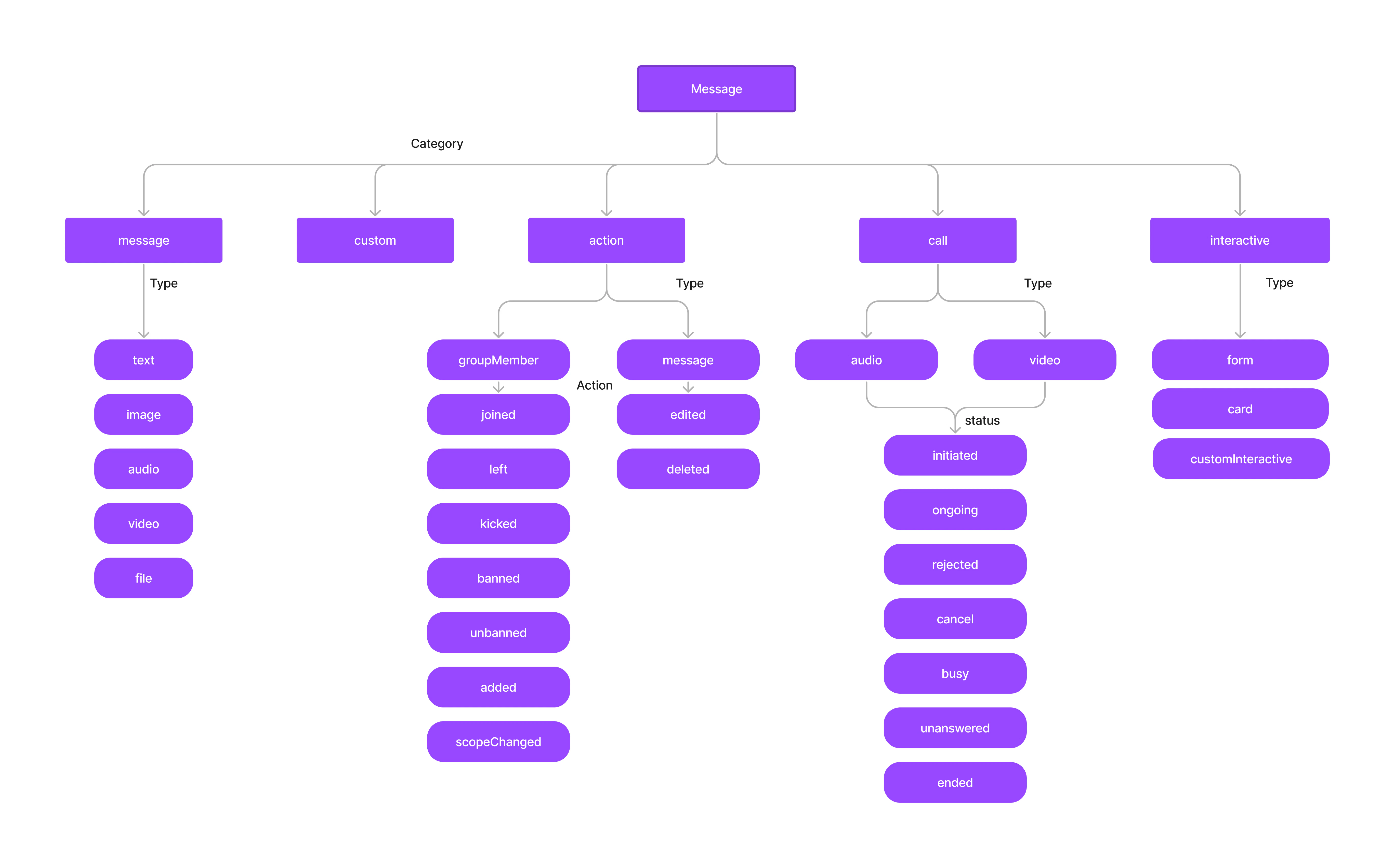 The below diagram helps you better understand the various message categories and types that a CometChat message can belong to.Documentation Index