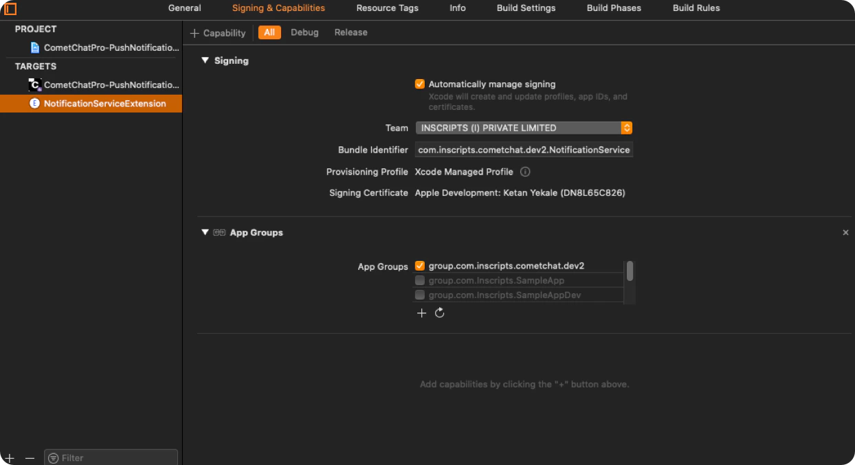 Project—>Targets—>Notification Service Extension Target—>Signing & Capabilities—> [+] —>App Groups.