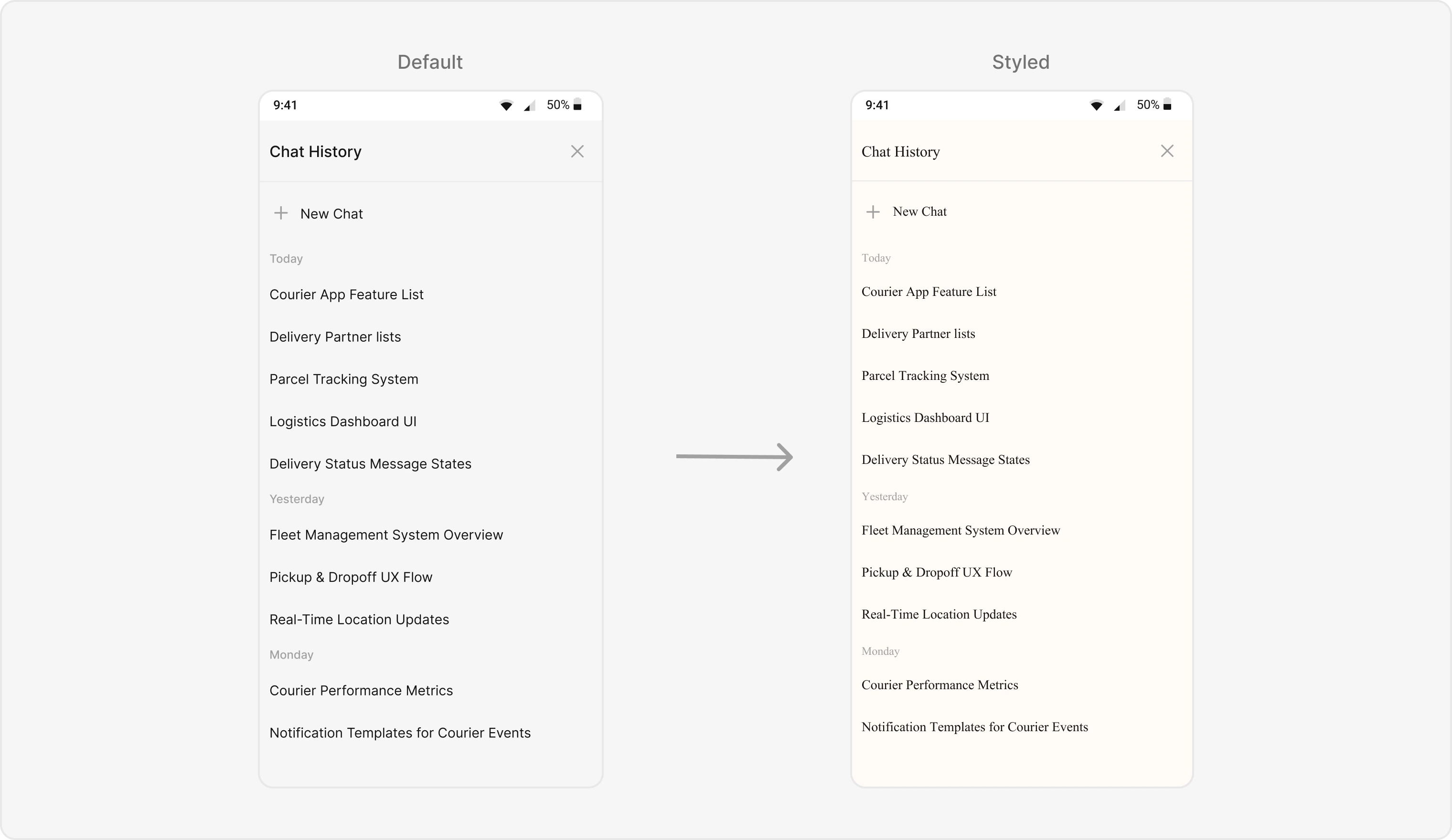 What this does: Defines a custom styleCustomAIAssistantChatHistoryStylethat sets the background color to#FFFAF6for the component, header, new chat area, date separator, and items. It applies a Times New Roman font to the header, new chat text, date separator, and item text. A helper styletextStyleTimesNewRomandefines the font family.