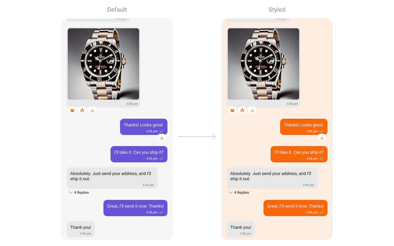What this does: Defines two custom styles:CustomOutgoingMessageBubbleStylesets the outgoing message bubble background to orange (#F76808);CustomCometChatMessageListStylesets the message list background to light peach (#FEEDE1) and applies the custom outgoing bubble style.