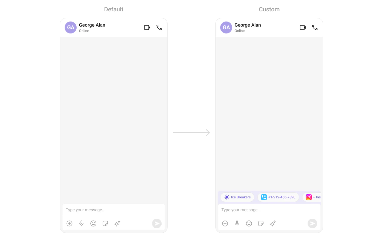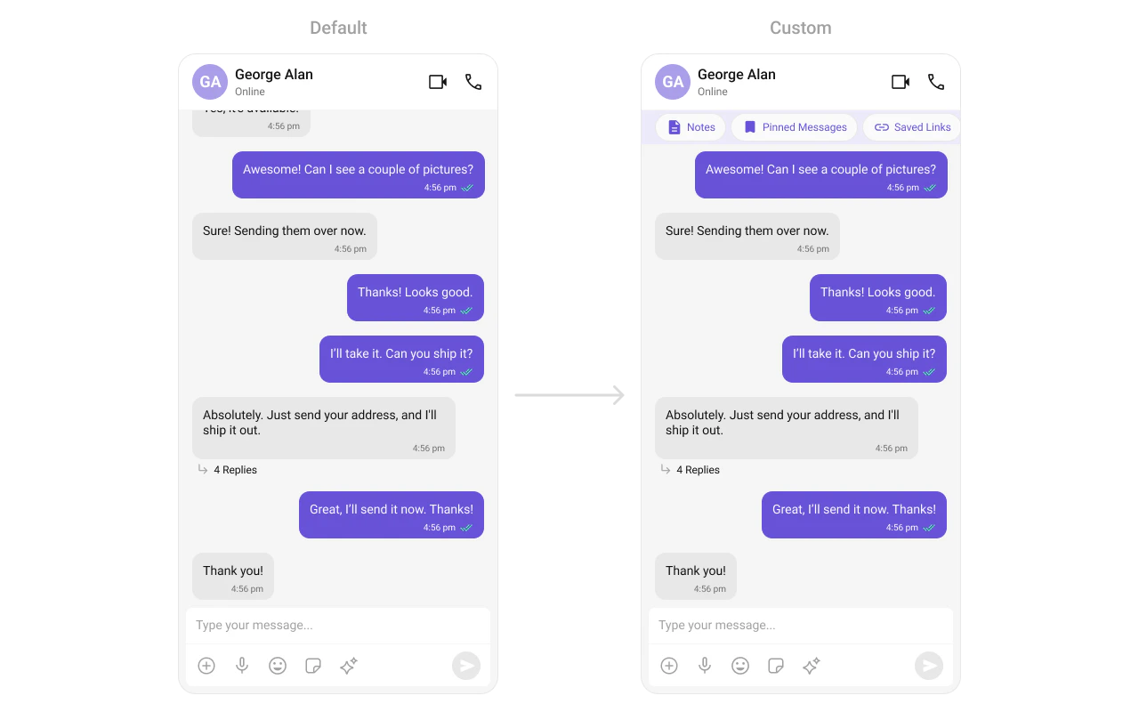 | Override behavior on user interaction | Activity/Fragment | setOn<Event> callbacks | setOnThreadRepliesClick((ctx, msg, tpl) -> { ... }) |