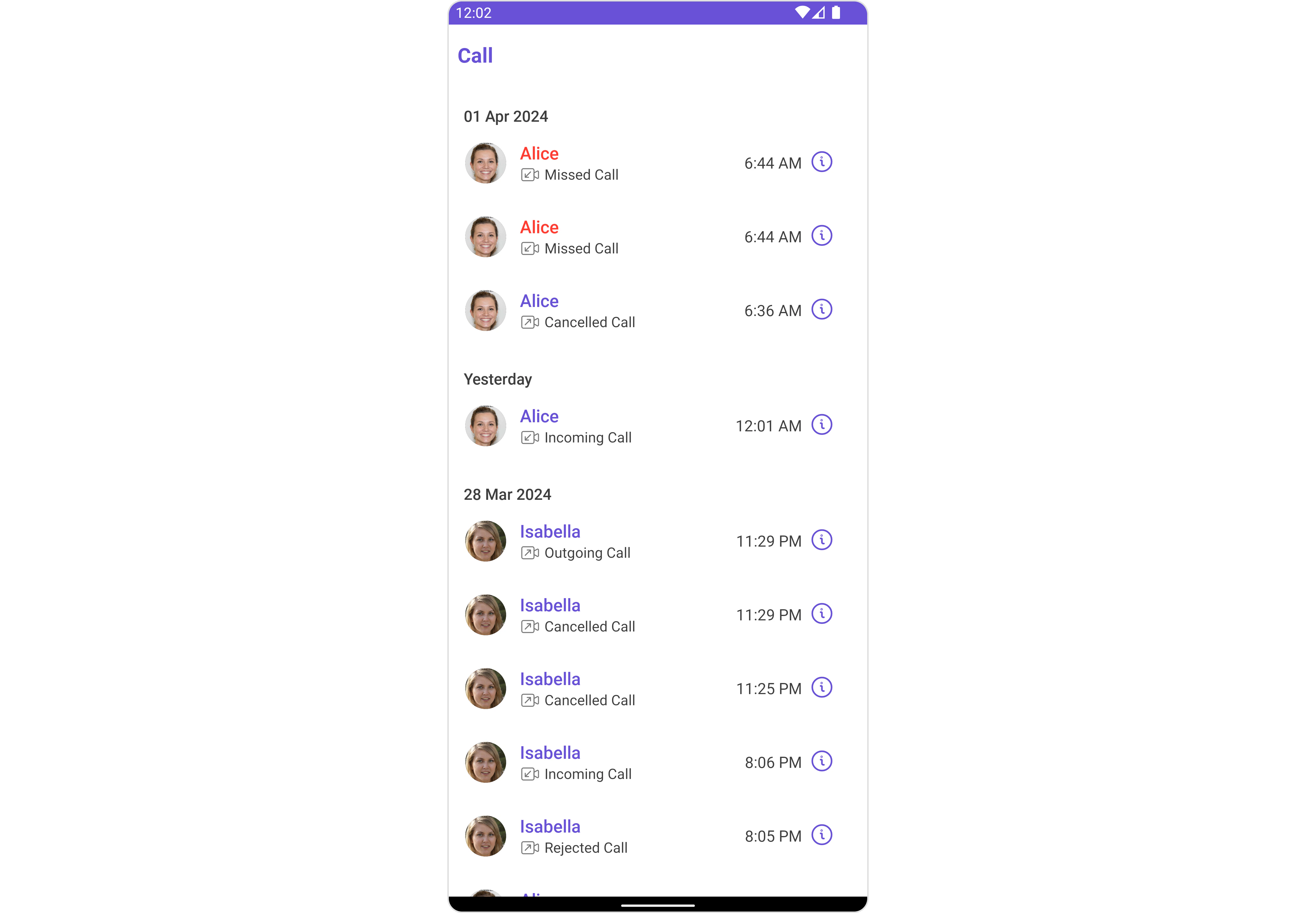 Call Logs component provides you with the records call events such as who called who, the time of the call, and the duration of the call. This information can be fetched from the CometChat server and displayed in a structured format for users to view their past call activities.