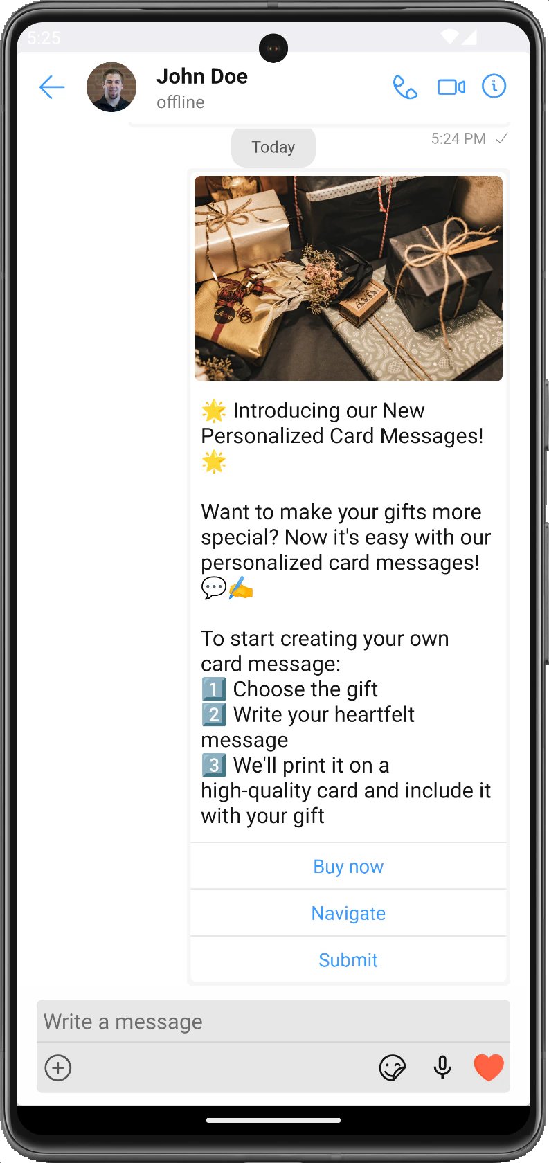 | setCardMessage | CardMessage | An instance of the CardMessage class which holds information about the card such as image URL, text, and action buttons. |