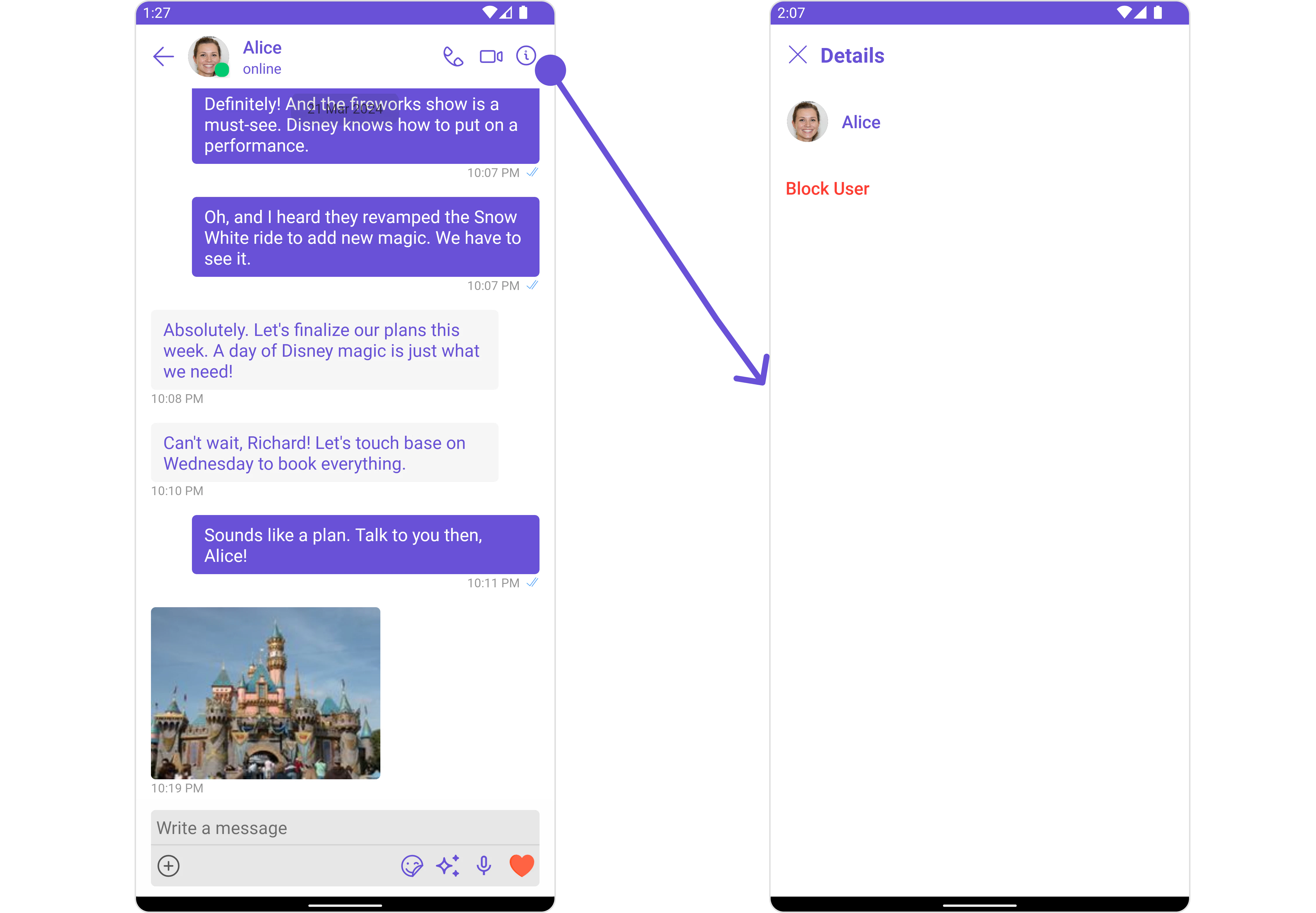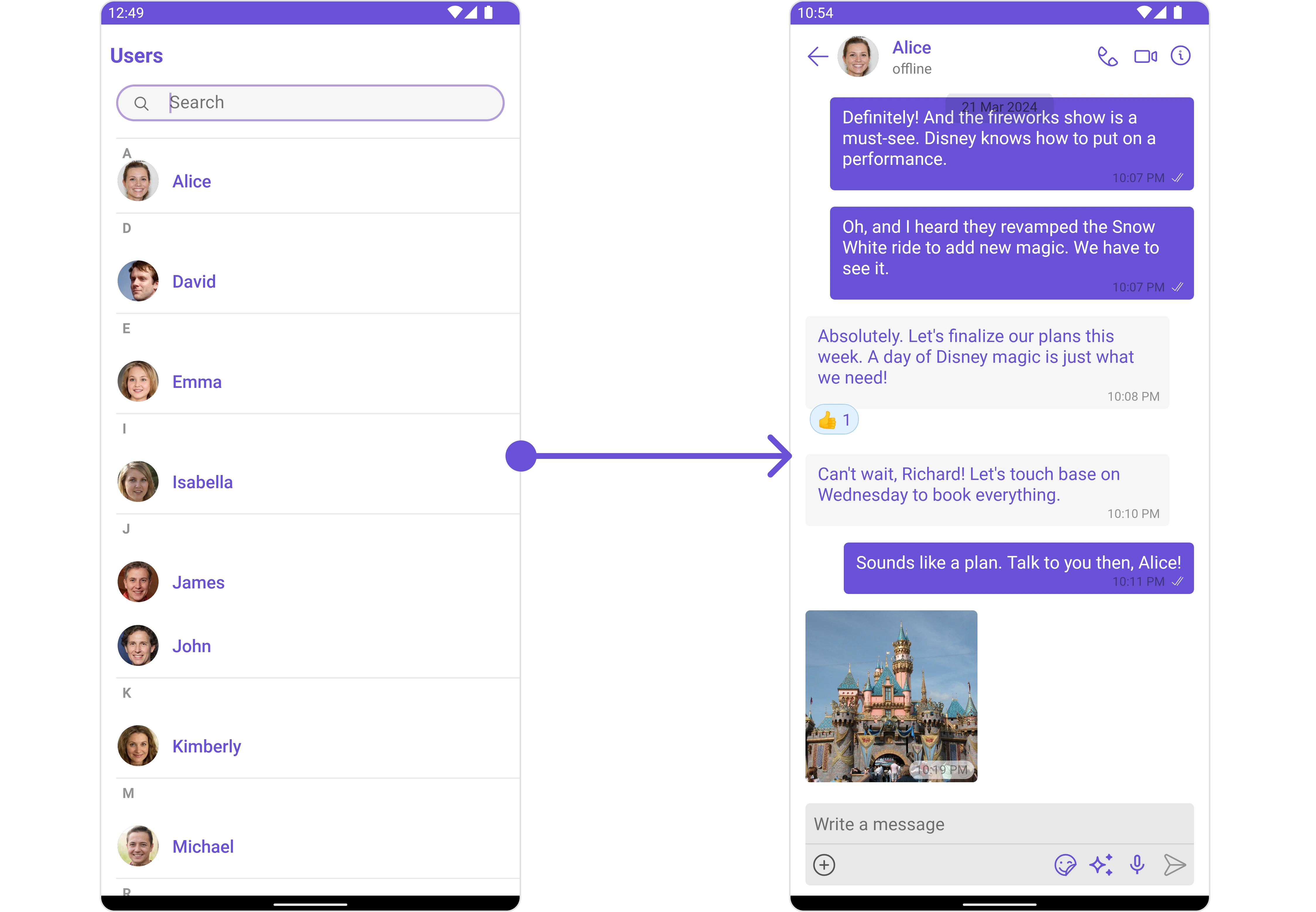 For advanced-level customization, you can set custom views to the component. This lets you tailor each aspect of the component to fit your exact needs and application aesthetics. You can create and define your own views, layouts, and UI elements and then incorporate those into the component. UsersWithMessages component does not have any advanced-level customization . You can use Advanced customisation its Components. For more details on individual component functionalities, you can refer Users Advanced and Messages Advanced. UsersWithMessages uses advanced-level customization of both Users & Messages components to achieve its default behavior.- UsersWithMessages utilizes the Itemclicklistener function of the