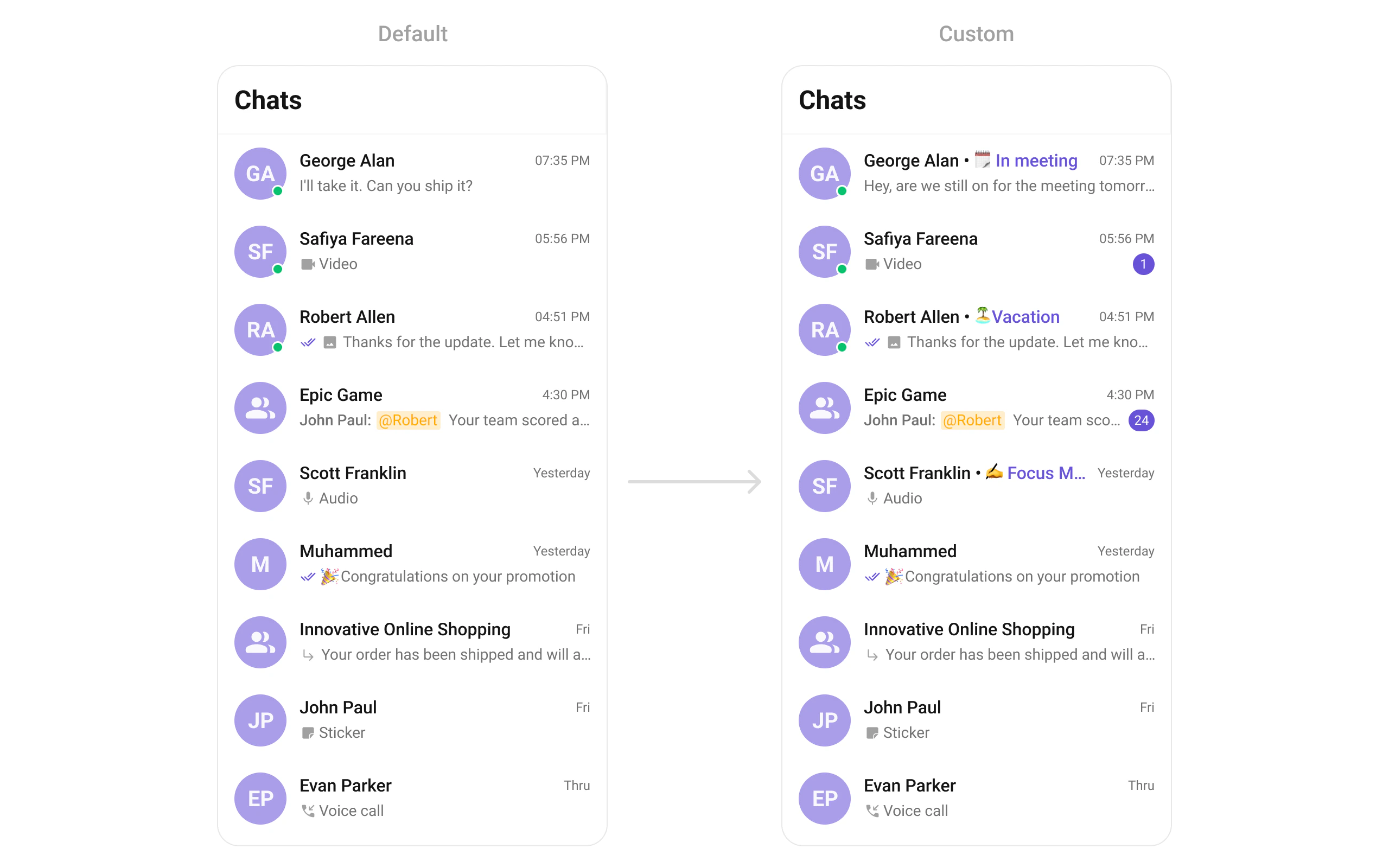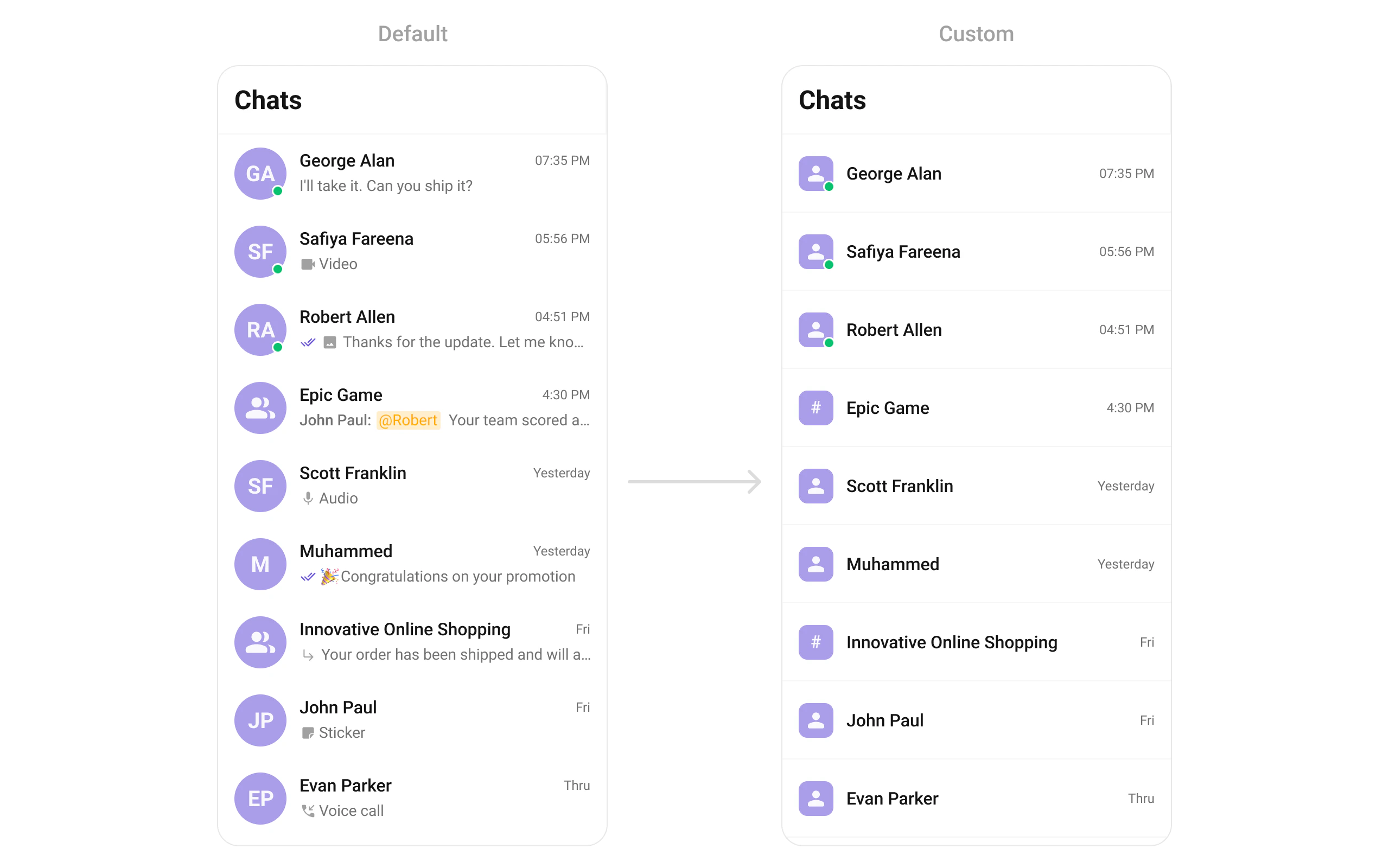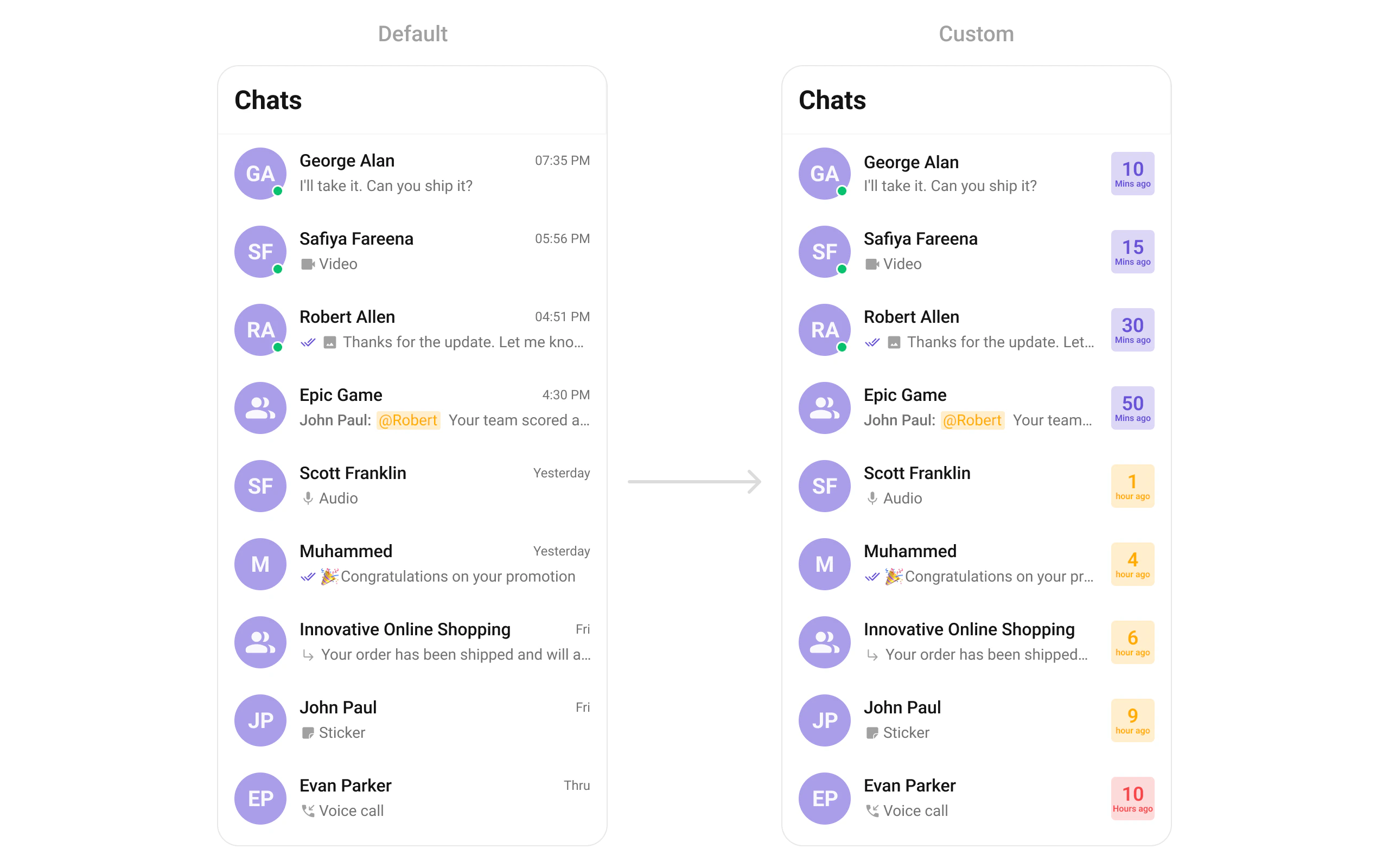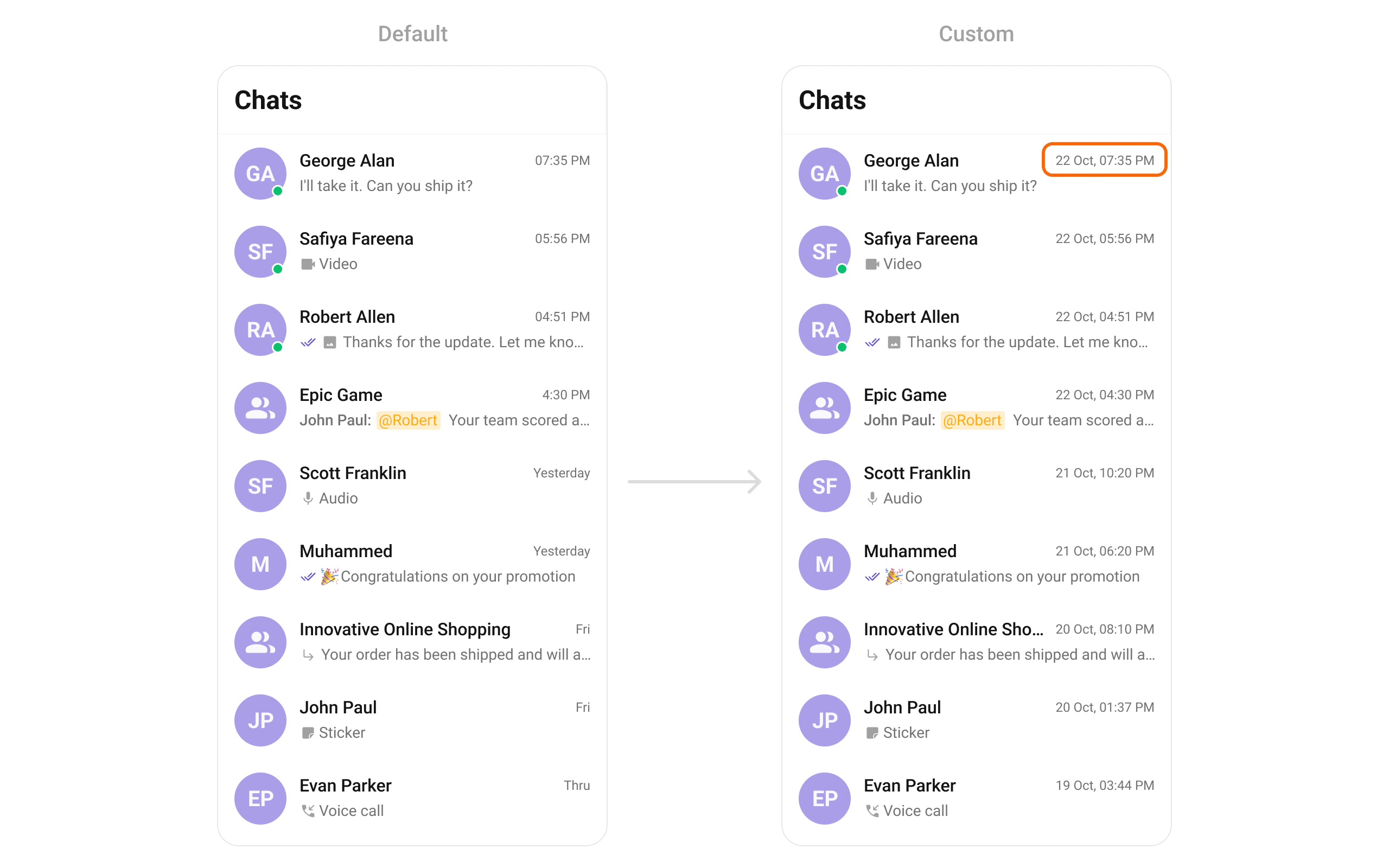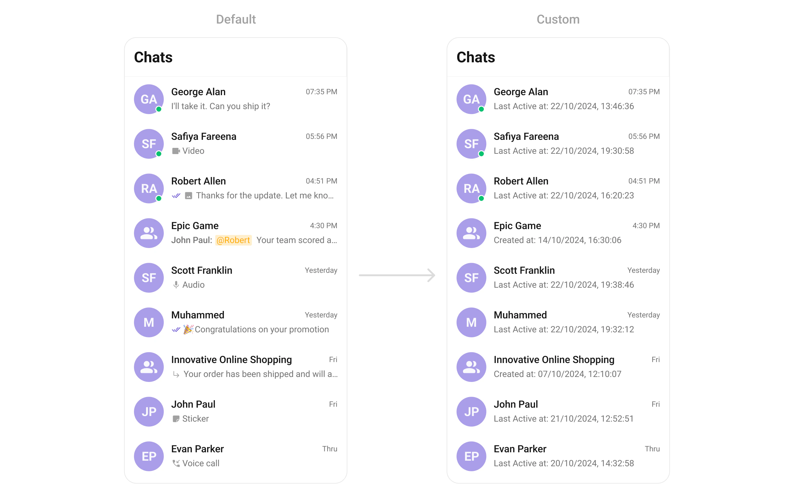 trailingView | Widget? Function(Conversation) | Timestamp / badge / right section |