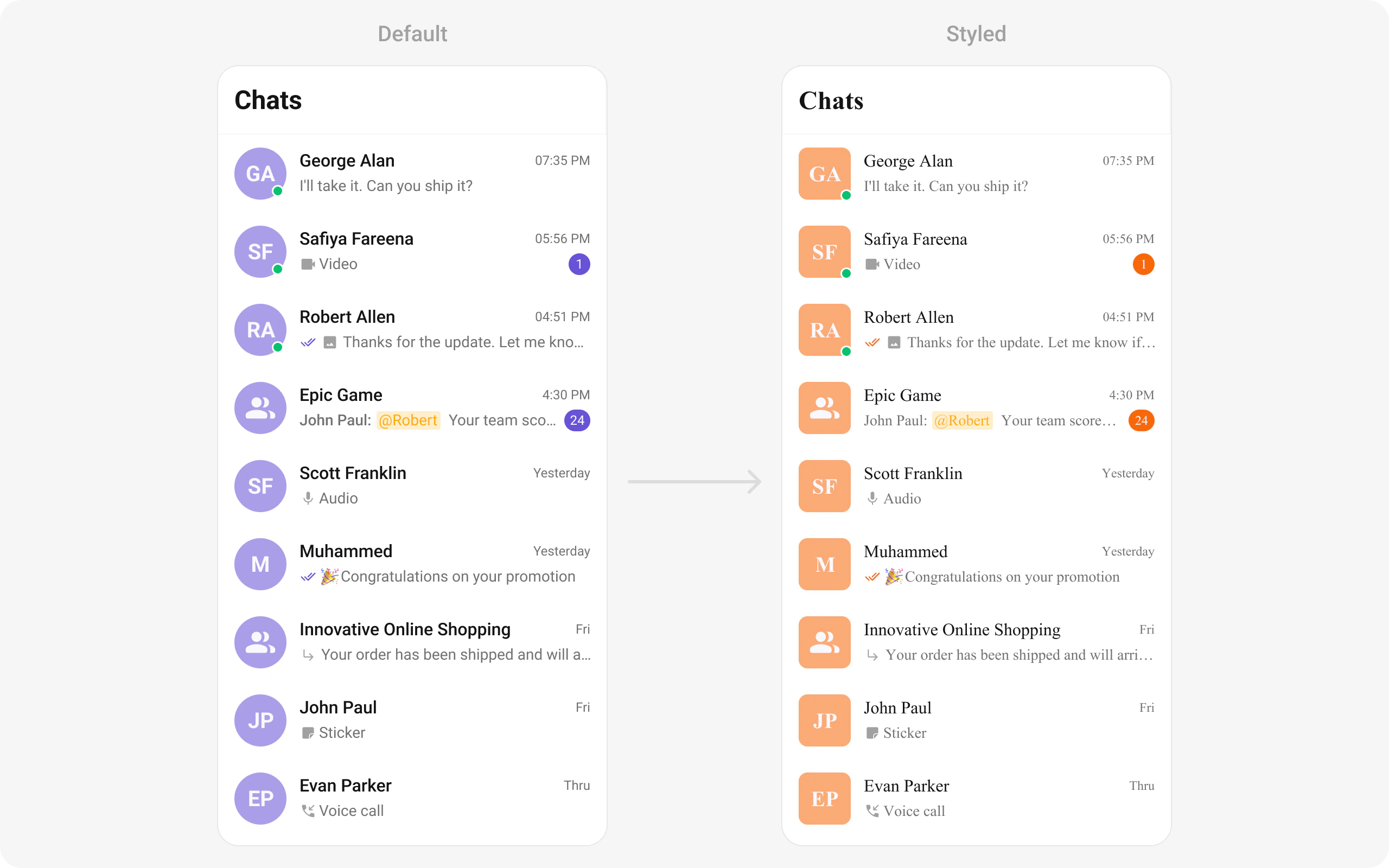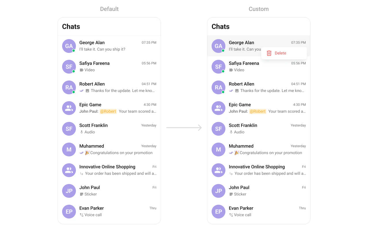 | Replace a section of the list item | Widget props | <slot>View render props | listItemView: (conversation) => CustomWidget() |