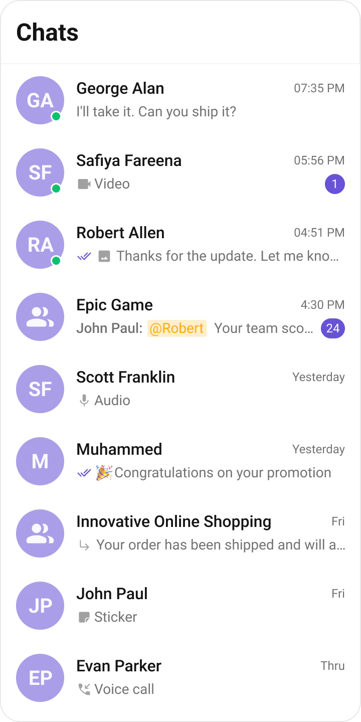 onTextMessageReceived / onMediaMessageReceived / onCustomMessageReceived | Moves conversation to top, updates last message preview and unread count |