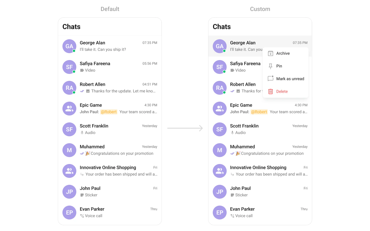 addOptions | List<CometChatOption>? Function(Conversation, Controller, BuildContext) | Context menu actions (adds to default) |