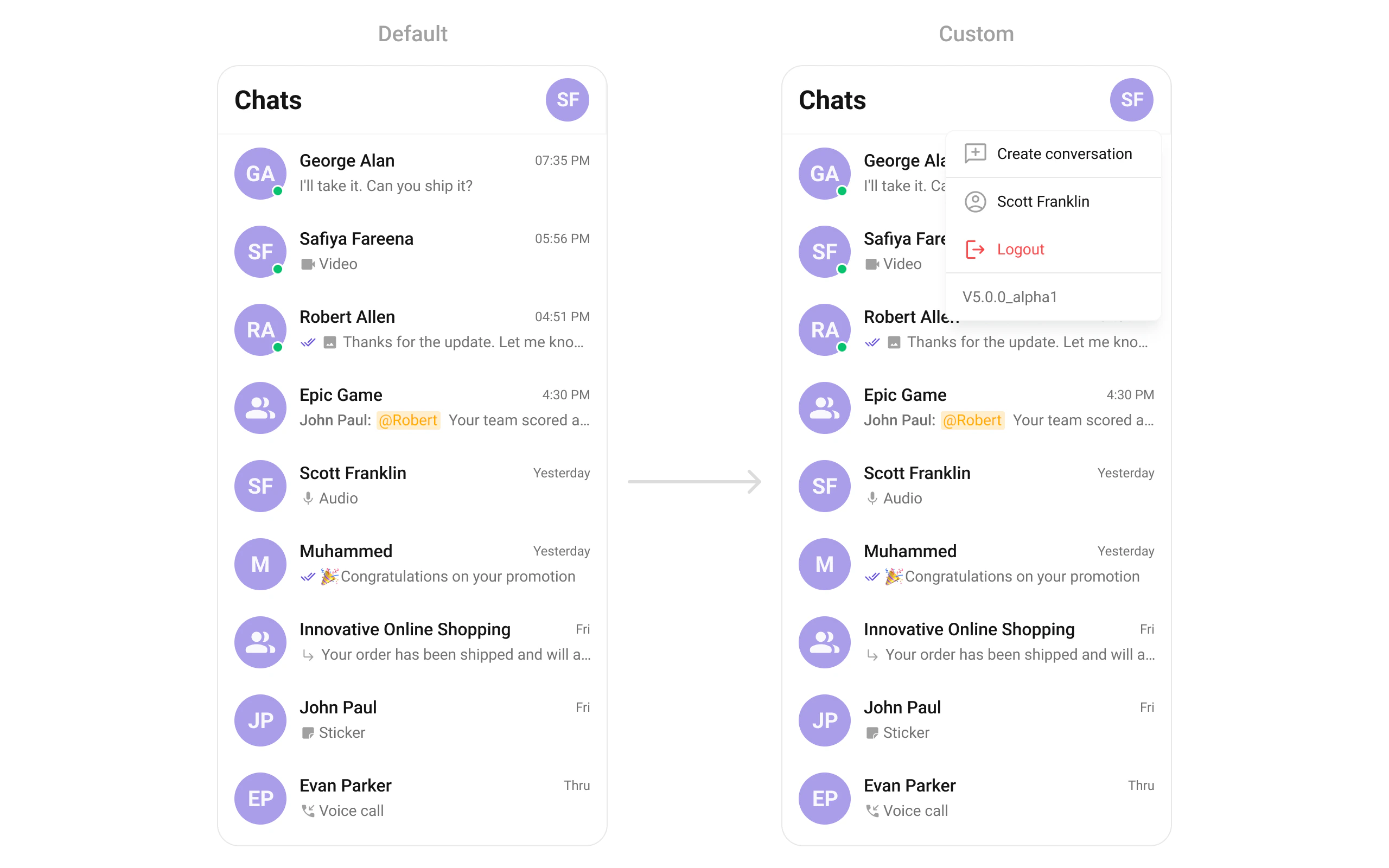 Each slot replaces a section of the default UI. Slots that accept a conversation parameter receive theConversation object for that row.