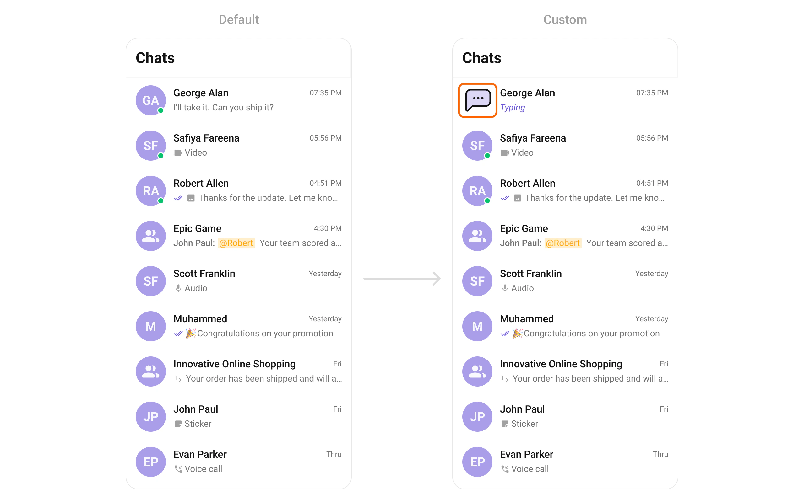 Replace the avatar / left section. Typing-aware avatar example.