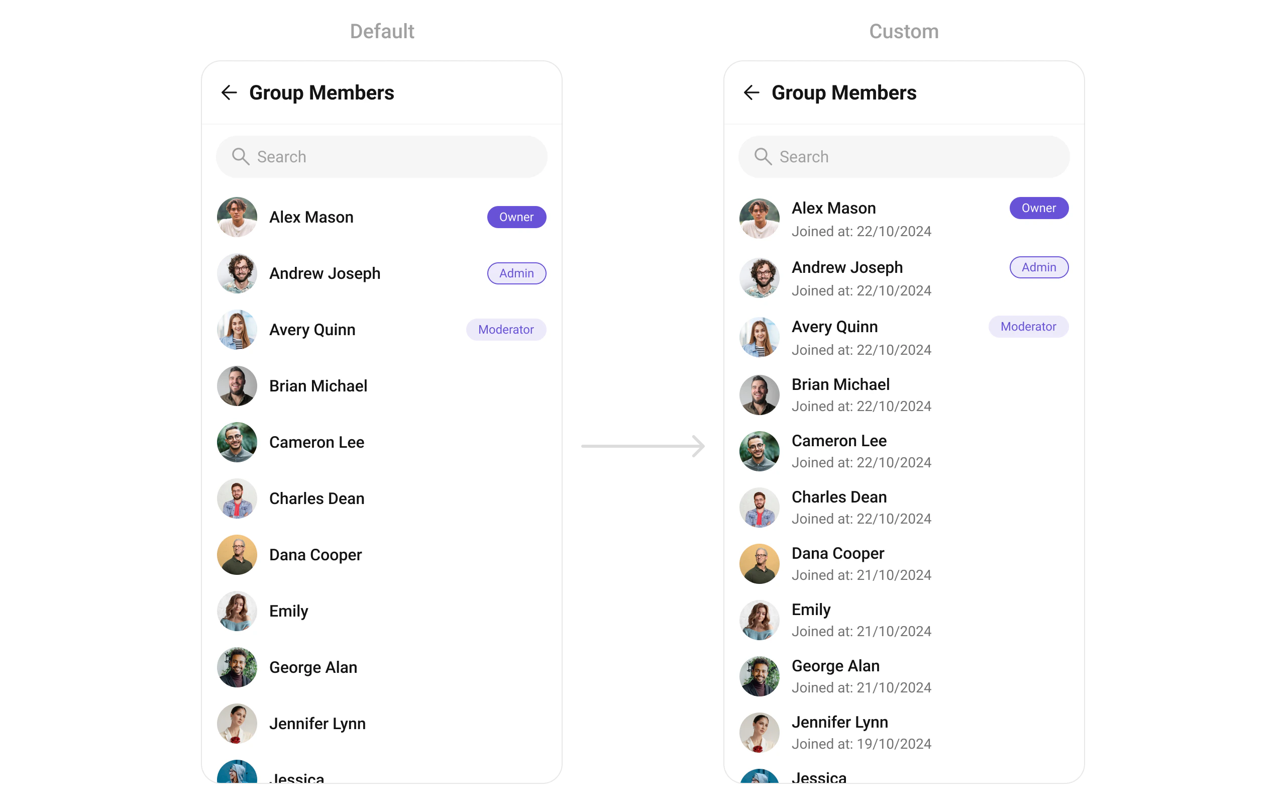 subtitleView | Widget? Function(BuildContext, GroupMember)? | null | Custom subtitle for each member |