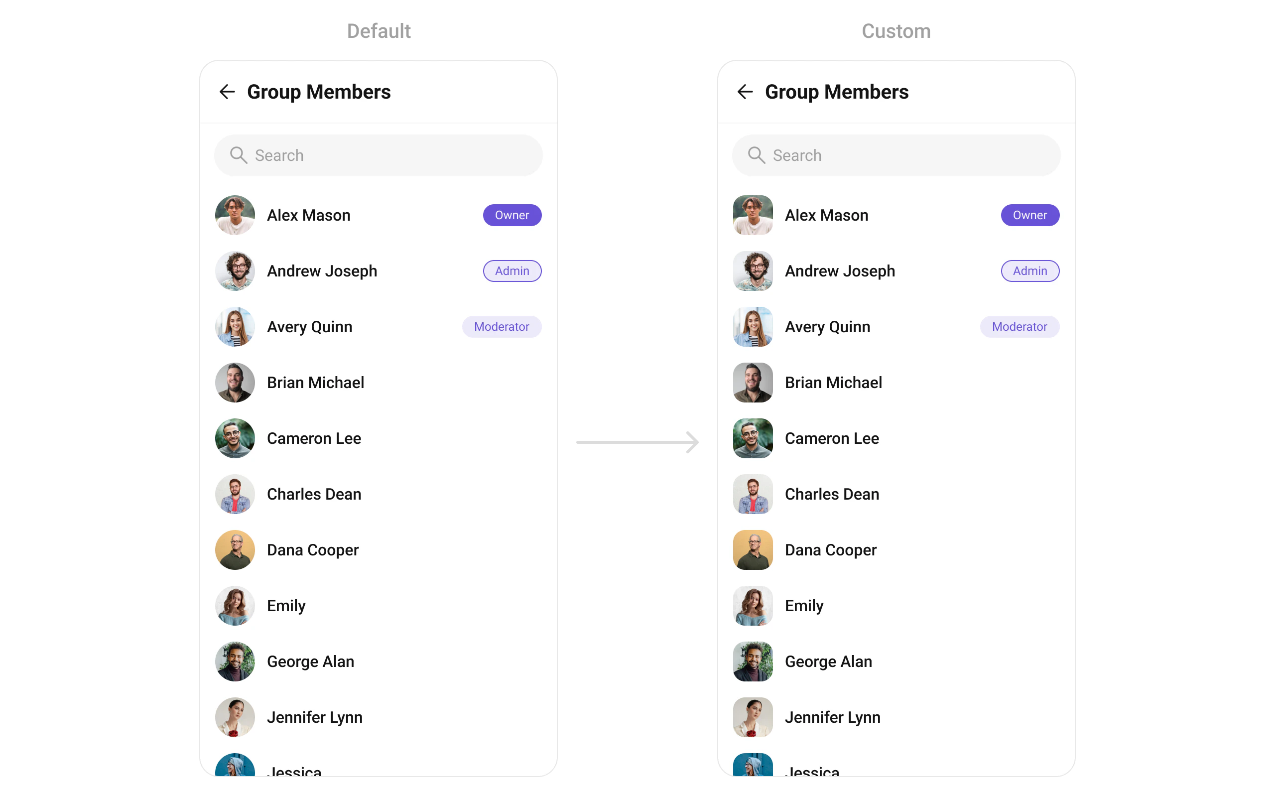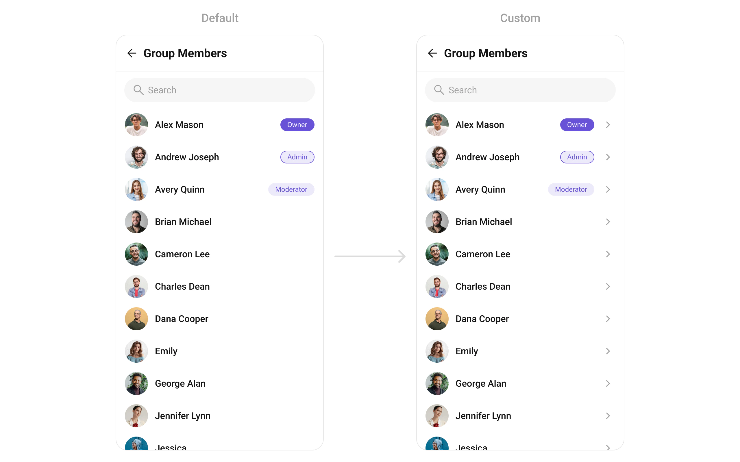 | CometChatListItem | Renders member information with title, subtitle, leading, and trailing widgets |