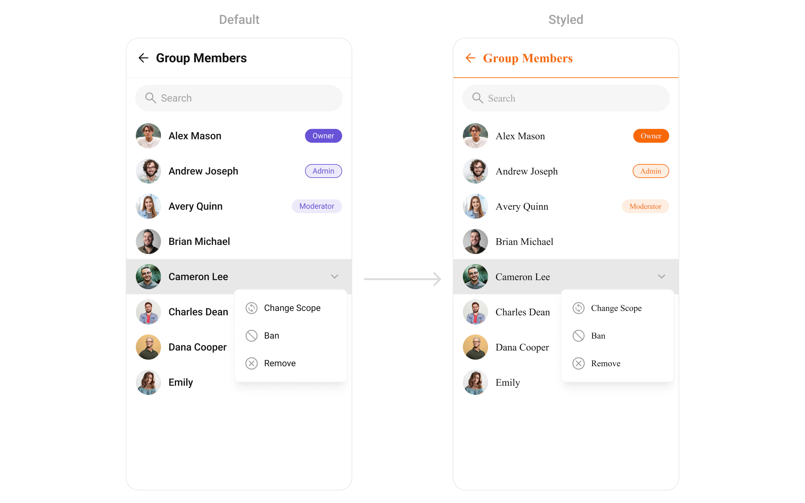 ownerMemberScopeTextColor | Color? | Text color for owner scope badge |