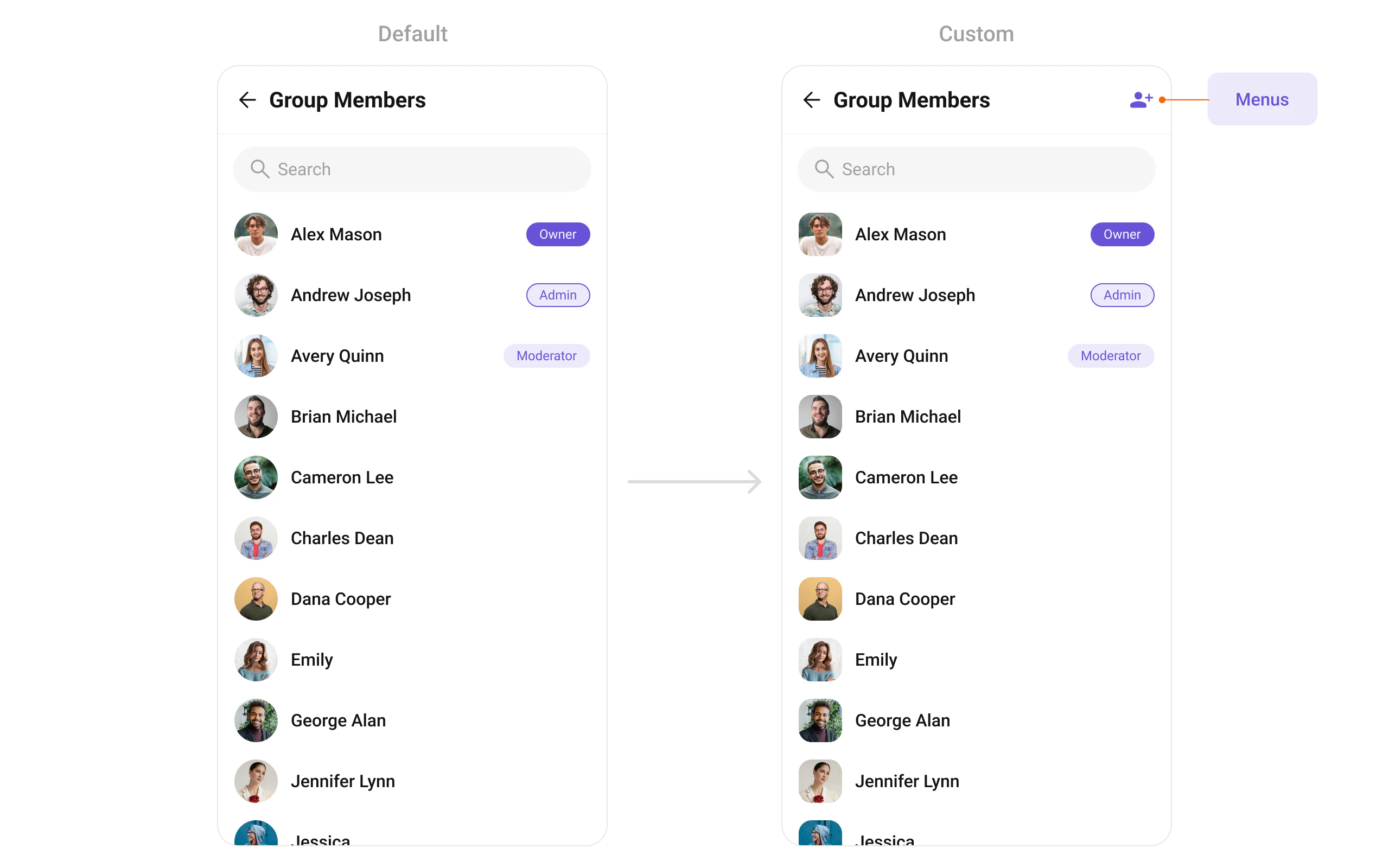 Each slot replaces a section of the default UI. Slots that accept a member parameter receive theGroupMember object for that row.