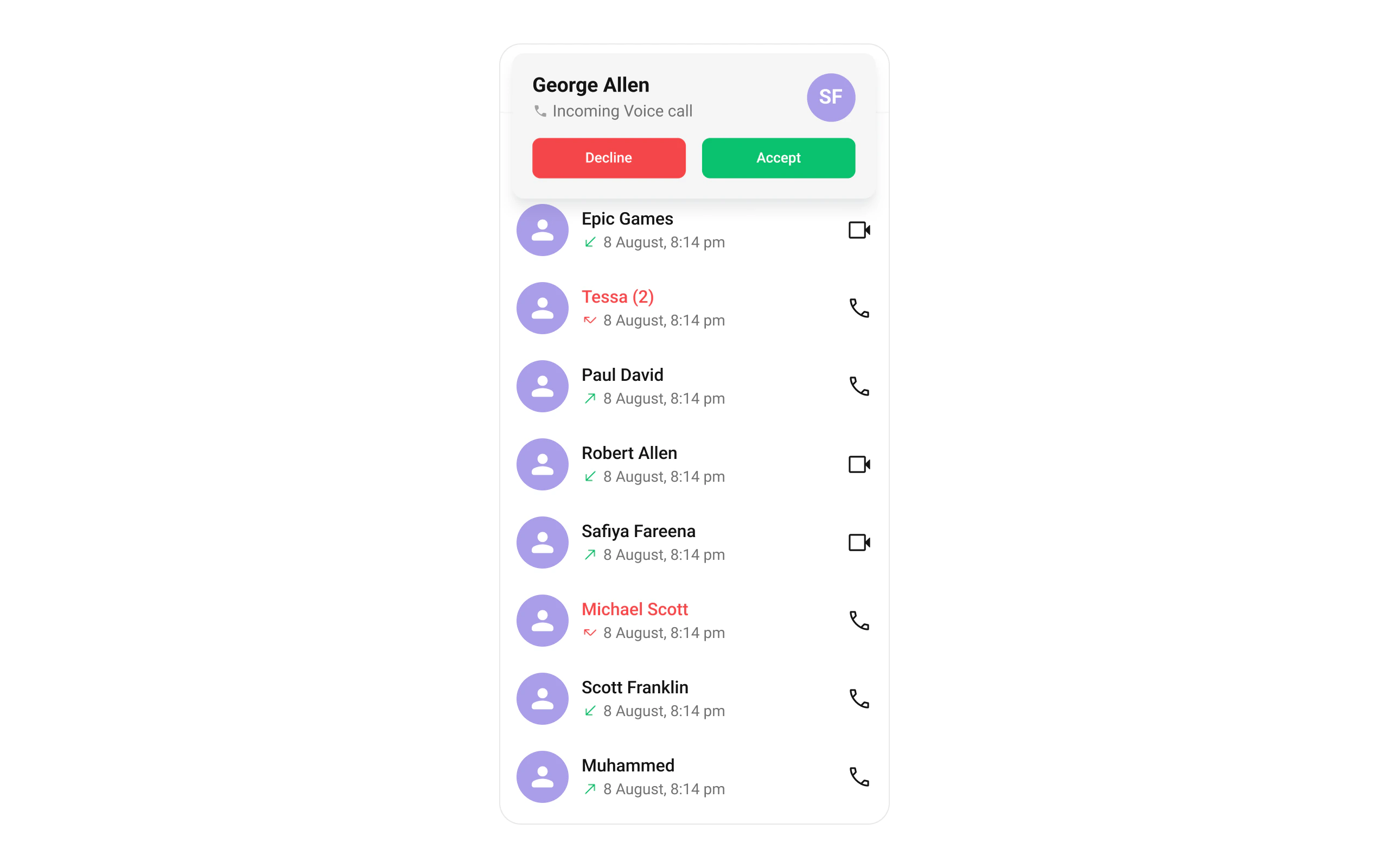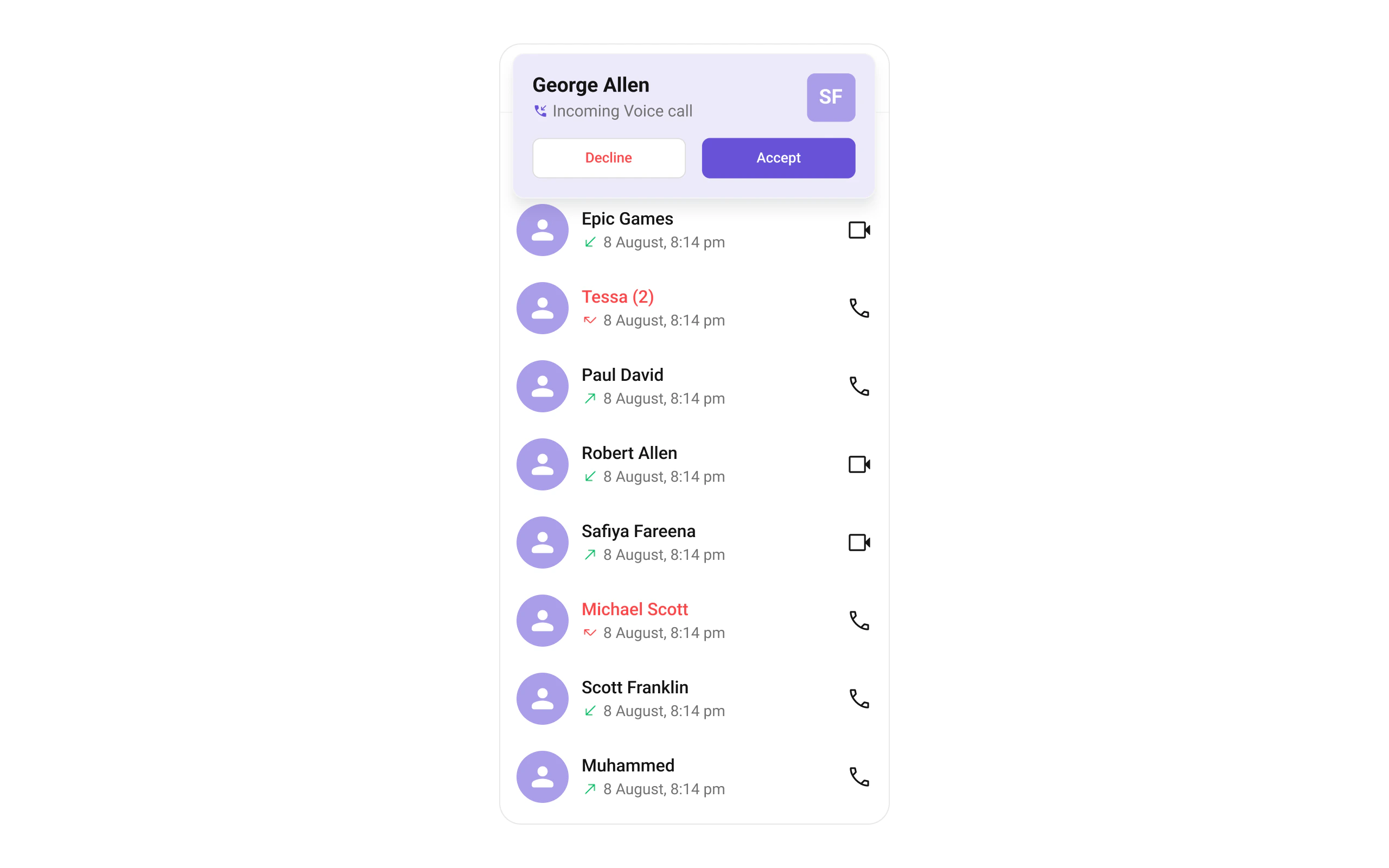 - Indicate the call type (Voice Call, Video Call).