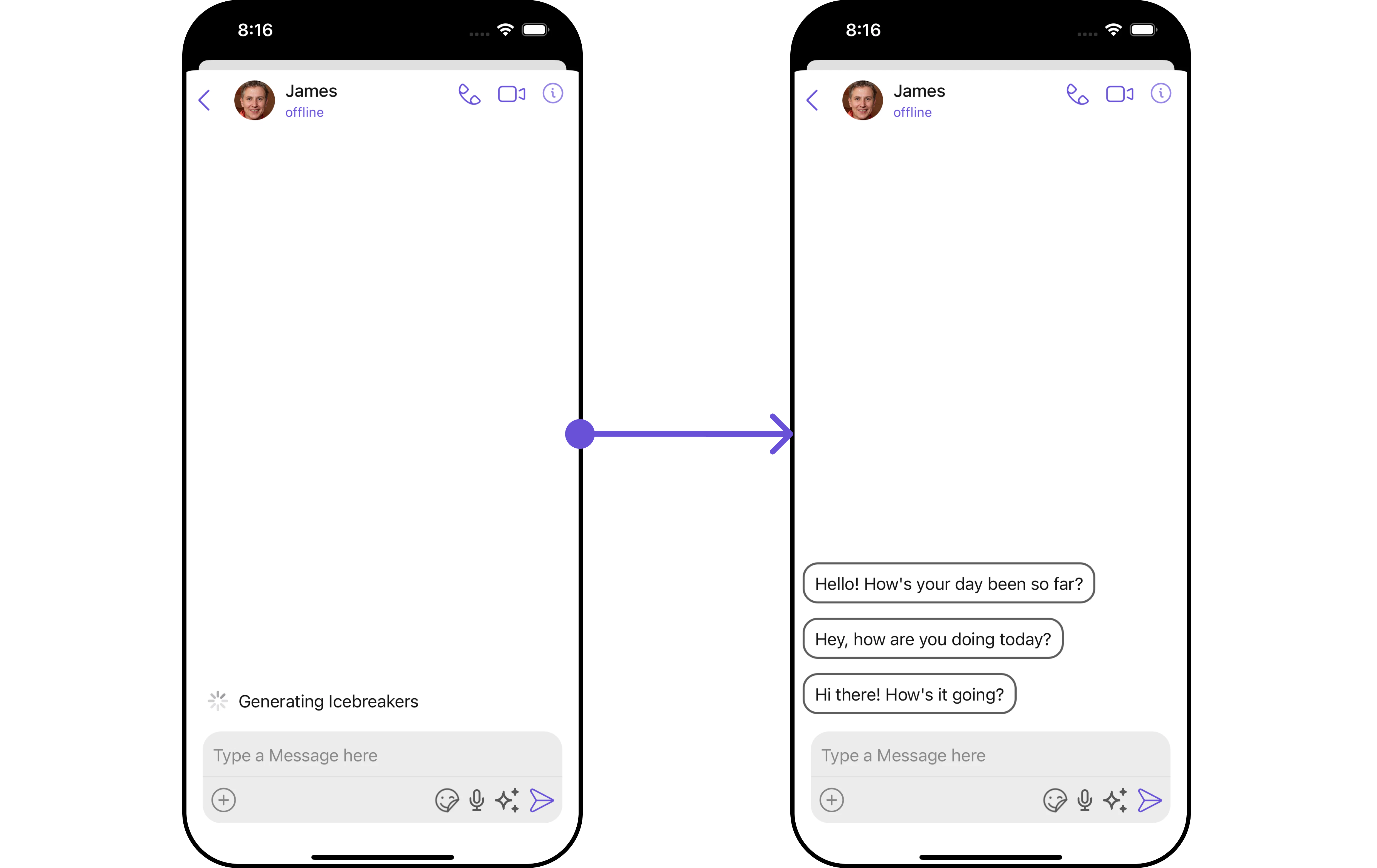 When a user initiates a new chat, the UI kit displays a list of suggested opening lines that users can select, making it easier for them to start a conversation. These suggestions are powered by CometChat’s AI, which predicts contextually relevant conversation starters. For a comprehensive understanding and guide on implementing and using the Conversation Starters, refer to our specific guide on the Conversation Starter. Once you have successfully activated the Conversation Starter from your CometChat Dashboard, the feature will automatically be incorporated into the MessageList Component of UI Kits.