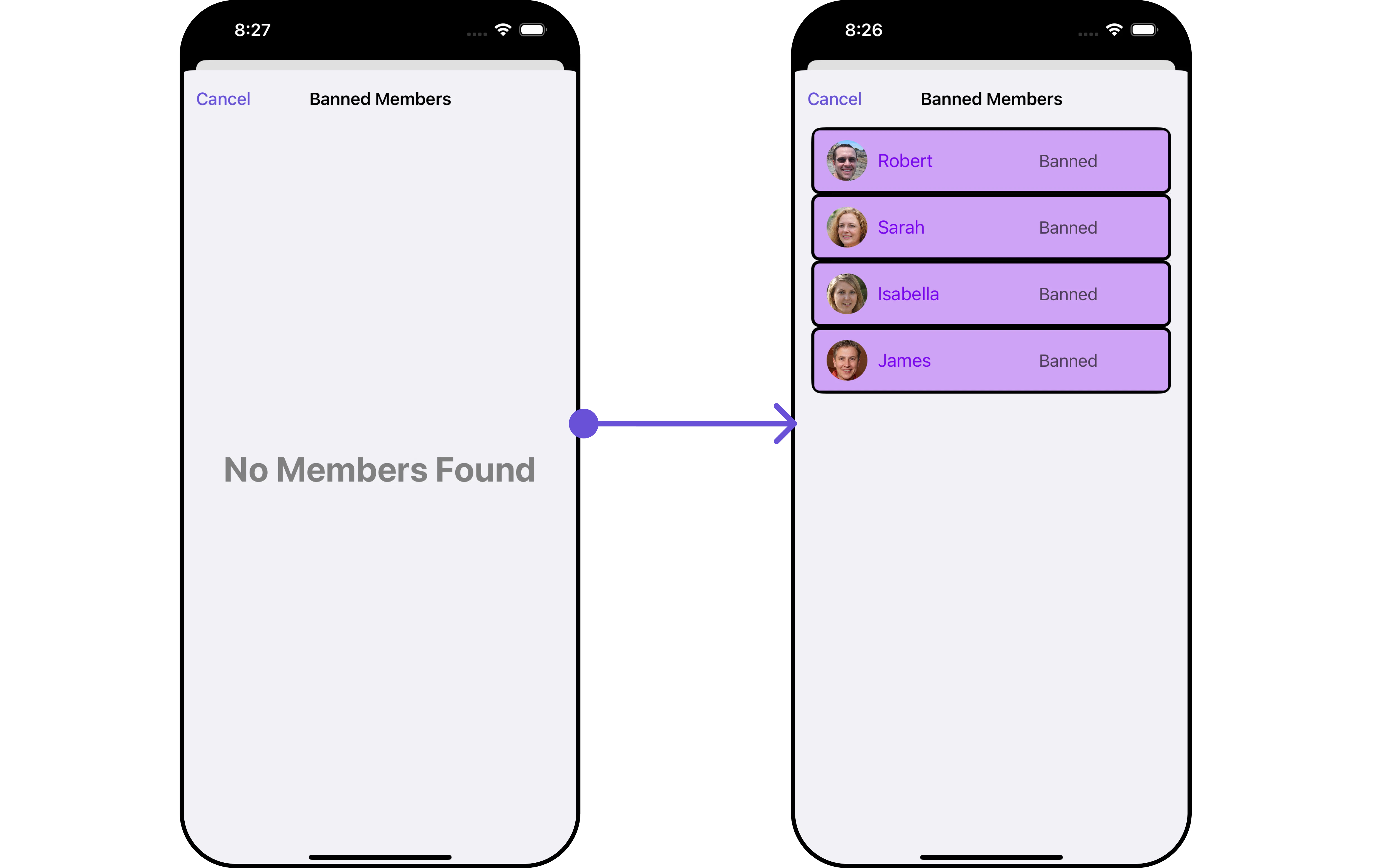 You can customize the properties of the Banned Members component by making use of theBannedMembersConfiguration. You can accomplish this by employing the bannedMembersConfiguration as demonstrated below: