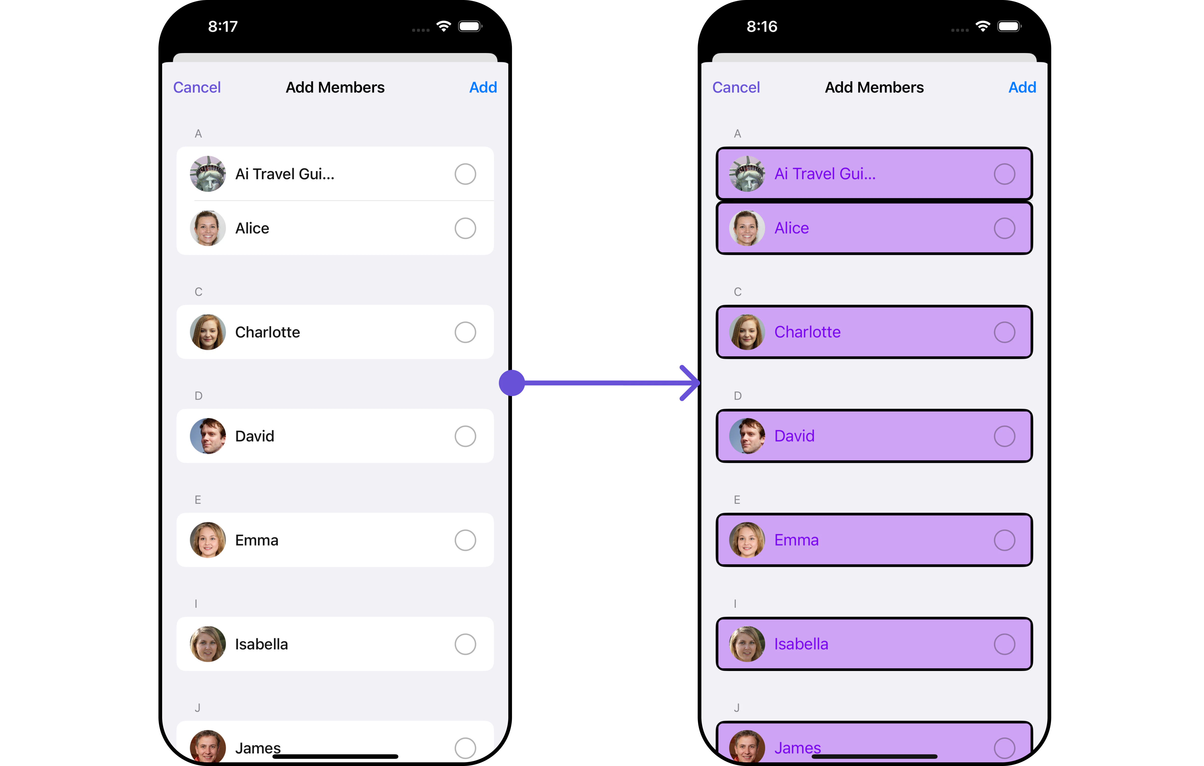 You can customize the properties of the Add Members component by making use of theAddMembersConfiguration. You can accomplish this by employing the addMembersConfiguration as demonstrated below: