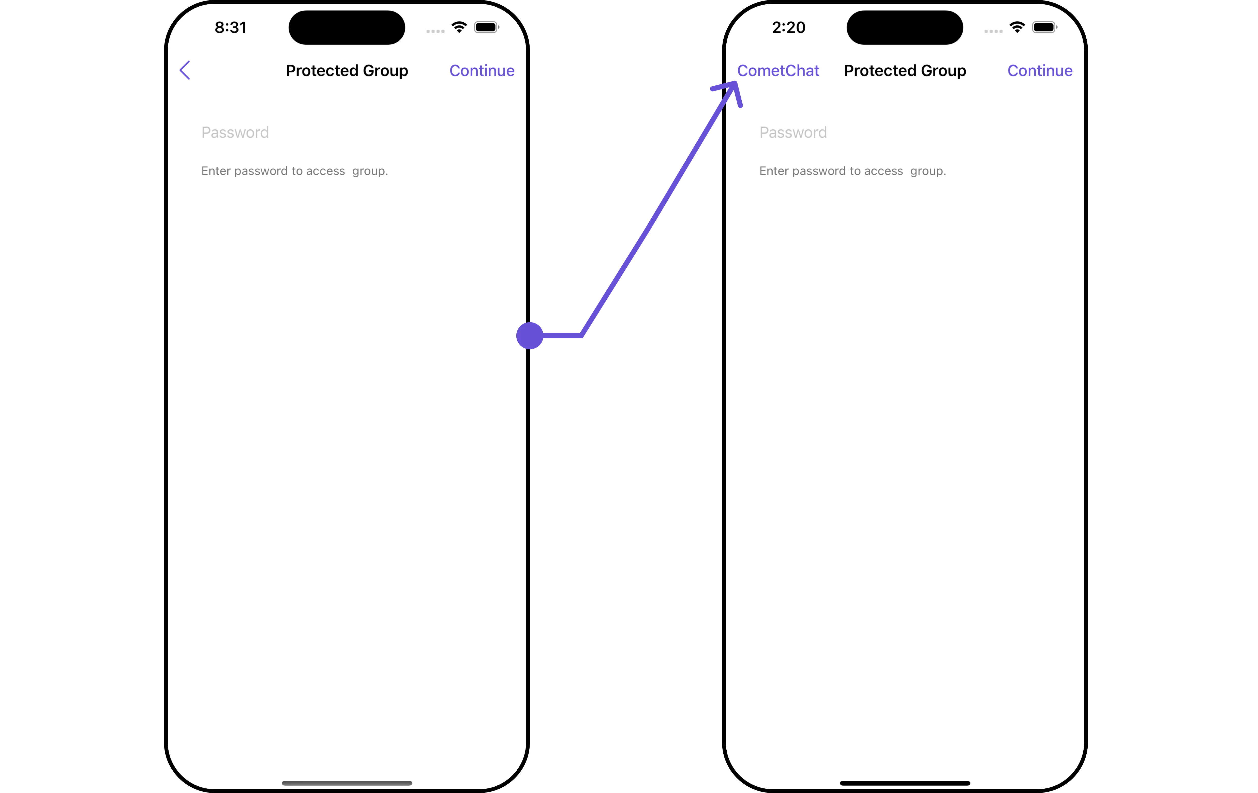 CometChatJoinProtectedGroup, as a custom view controller, offers flexible integration options, allowing it to be launched directly via button clicks or any user-triggered action. Additionally, it seamlessly integrates into tab view controllers. With join group, users gain access to a wide range of parameters and methods for effortless customization of its user interface.