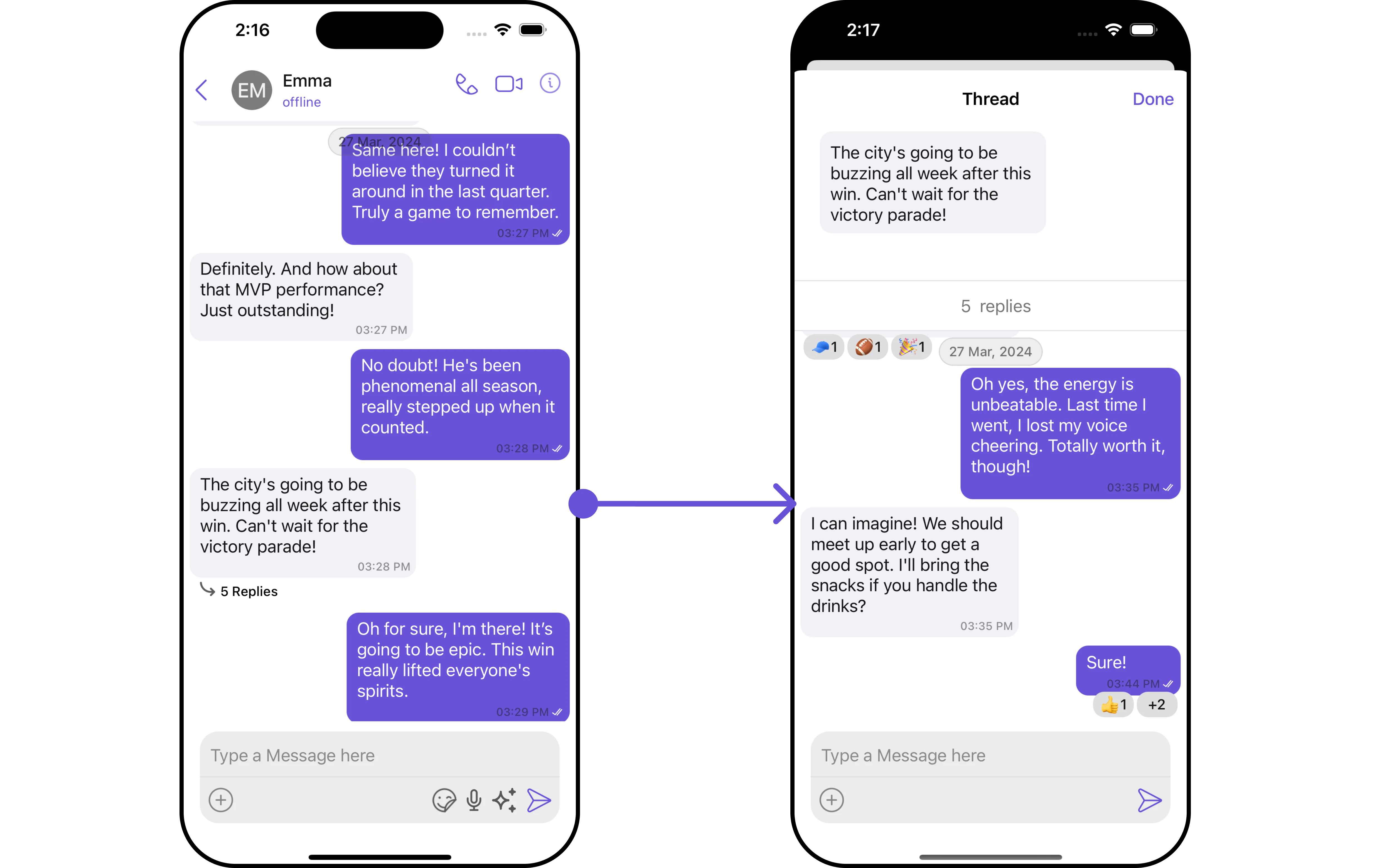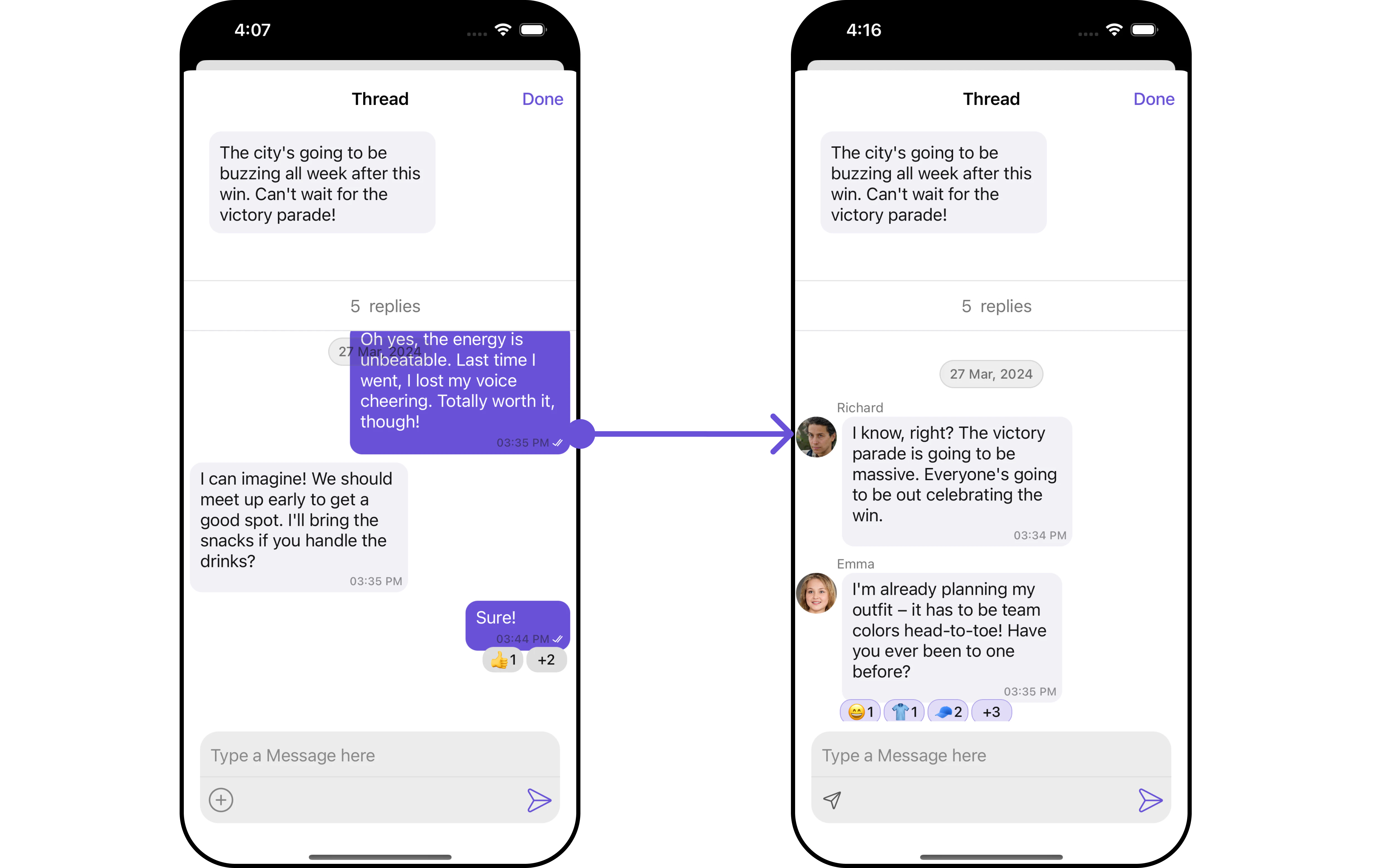 Actions dictate how a component functions. They are divided into two types: Predefined and User-defined. You can override either type, allowing you to tailor the behavior of the component to fit your specific needs. The Messages component does not have its actions. However, since it’s a Composite Component, you can use the actions of its components by utilizing the Configurations object of each component. Example In this example, we are employing the ThreadRepliesClick action from the MessageList Component through the MessageListConfiguration object.- Swift