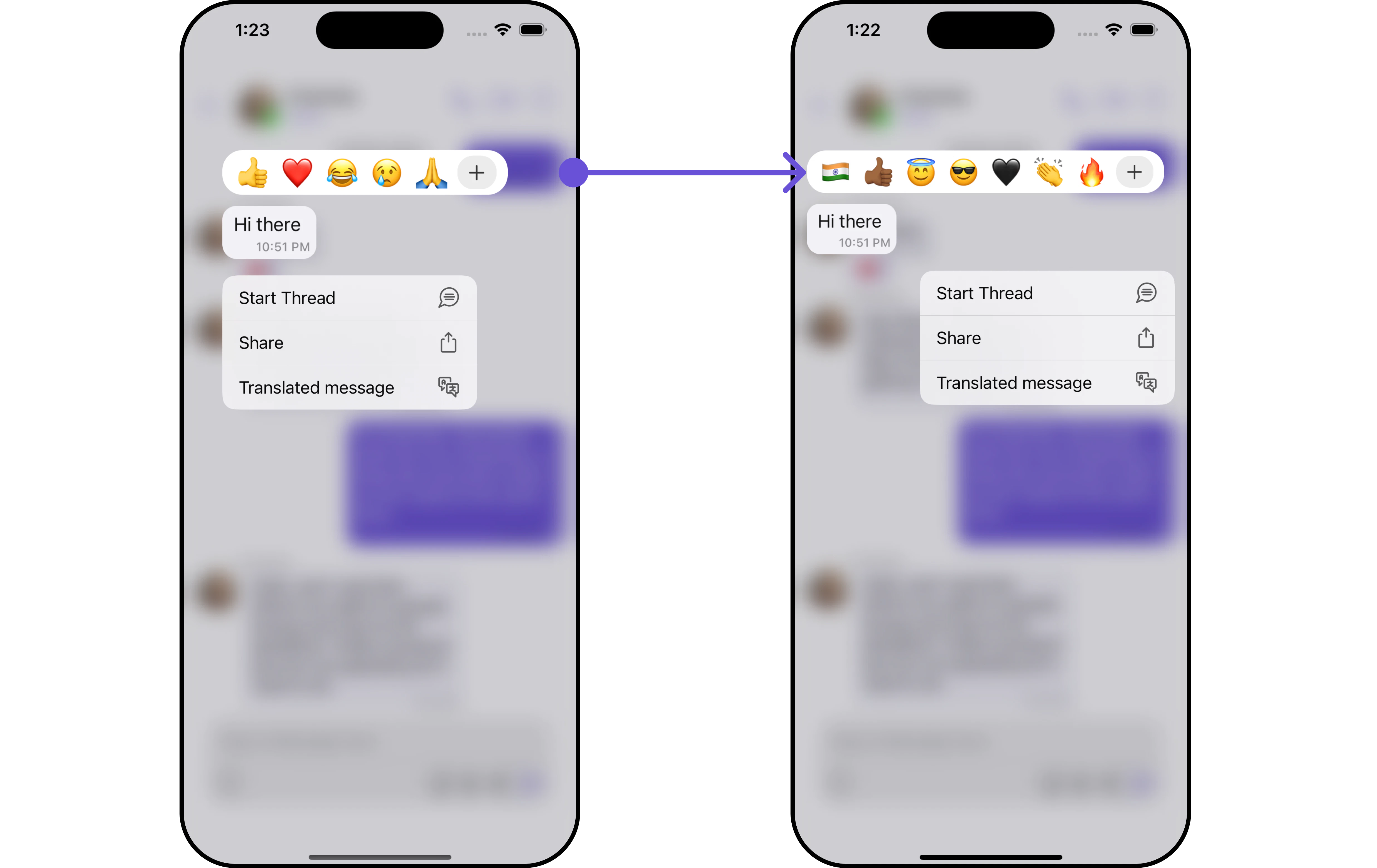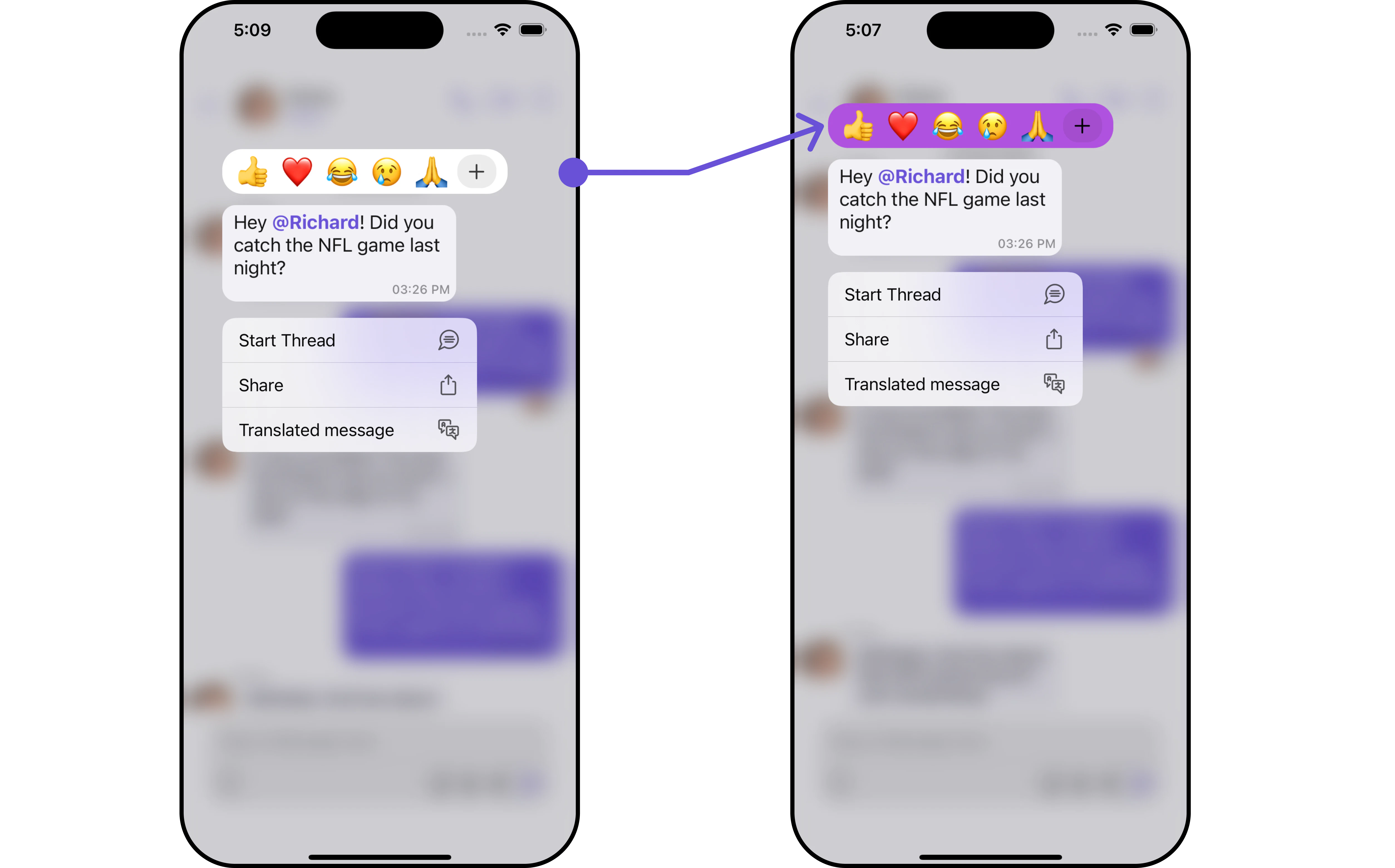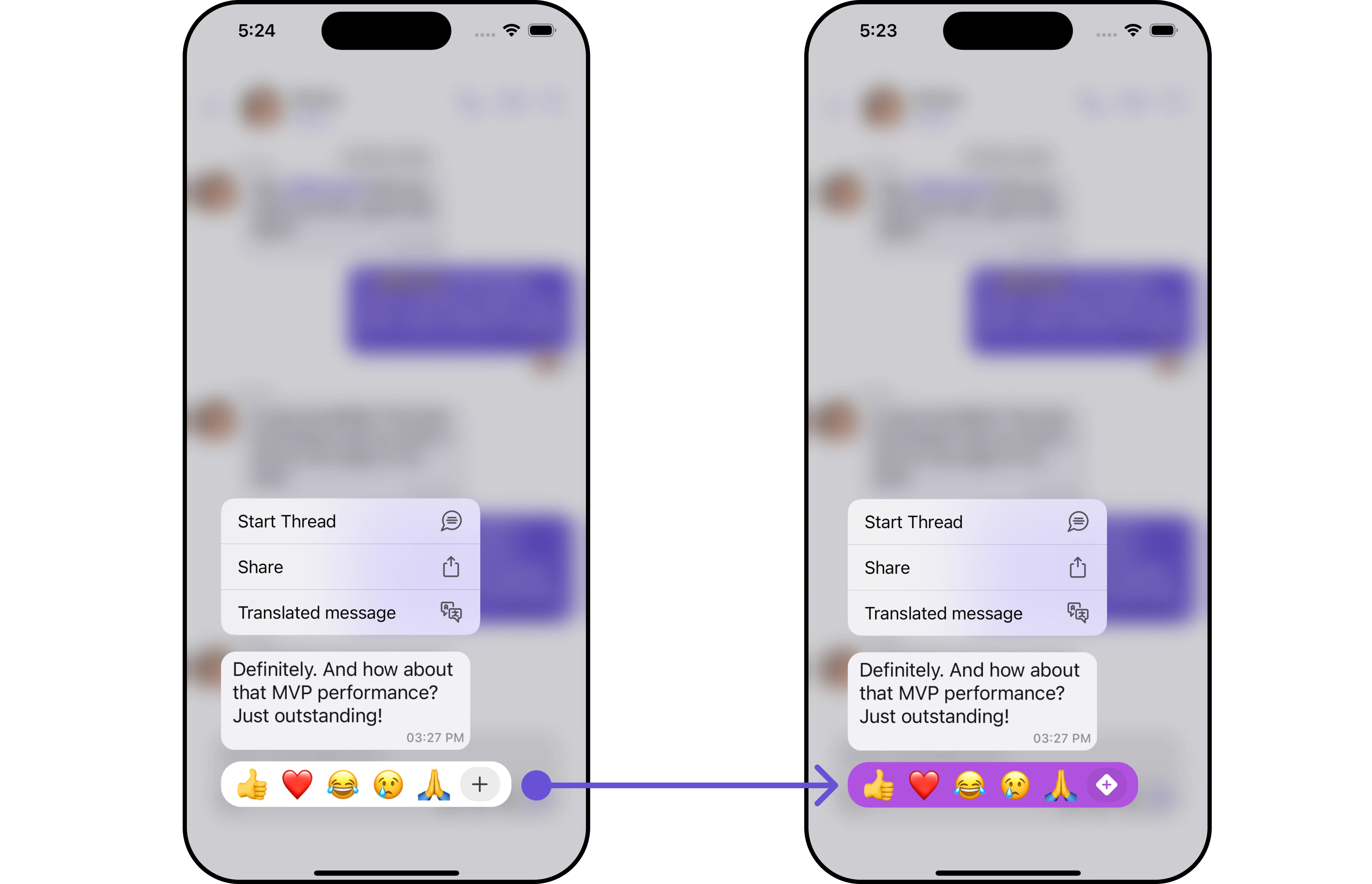 By leveraging custom configurations, such as QuickReactionsStyle and QuickReactionsConfiguration, users can seamlessly add reactions to messages, enriching their communication experience. Notably, we’ve fine-tuned the visual aspects, setting the background color to systemPurple and ensuring clarity with a white plus icon.