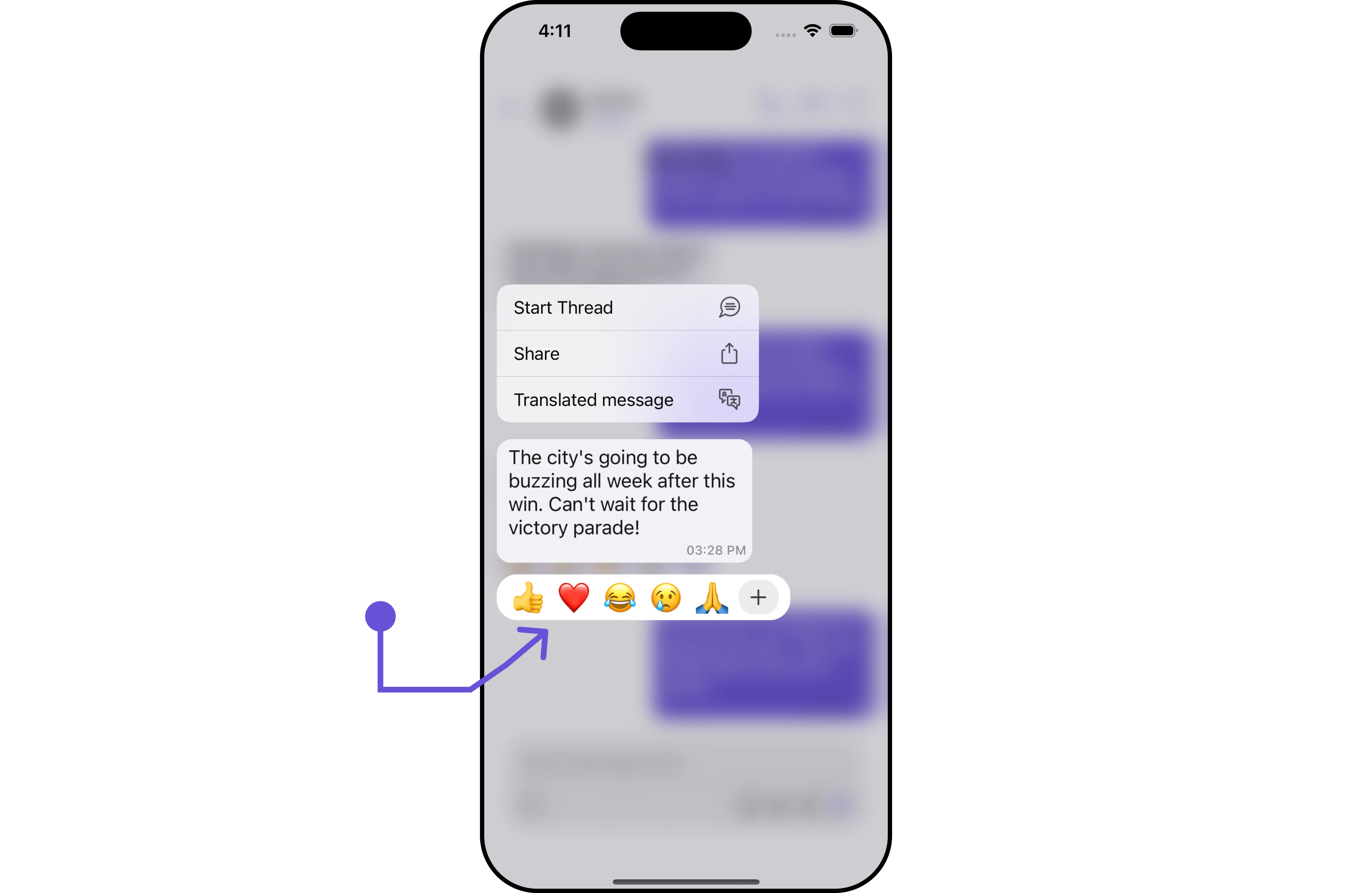 The number of reactions shown depends on the message bubble width. If the message bubble can only fit a limited number of reactions, it displays the first few with an indicator for additional reactions not immediately visible. This indicator informs users of the total number of reactions available.