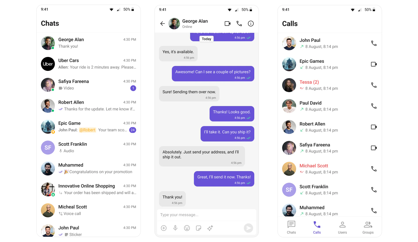 | Layout | Tabbed navigation (Chats, Users, Groups, Calls) + message view |