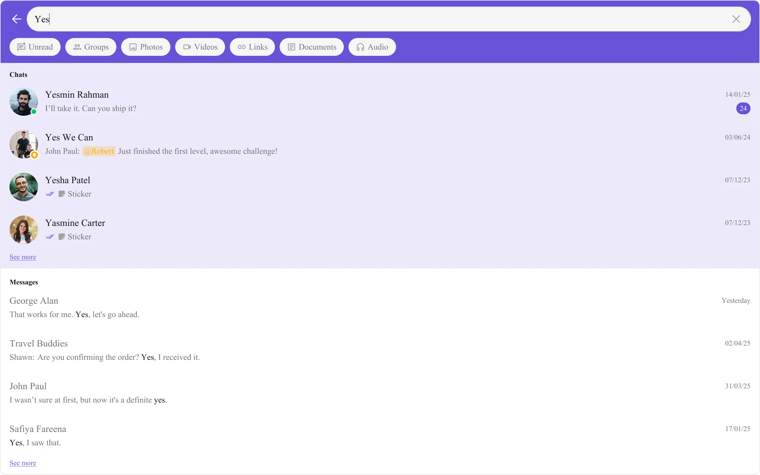 | Control search scope | Component props | searchIn | searchIn={[CometChatSearchScope.Messages]} |