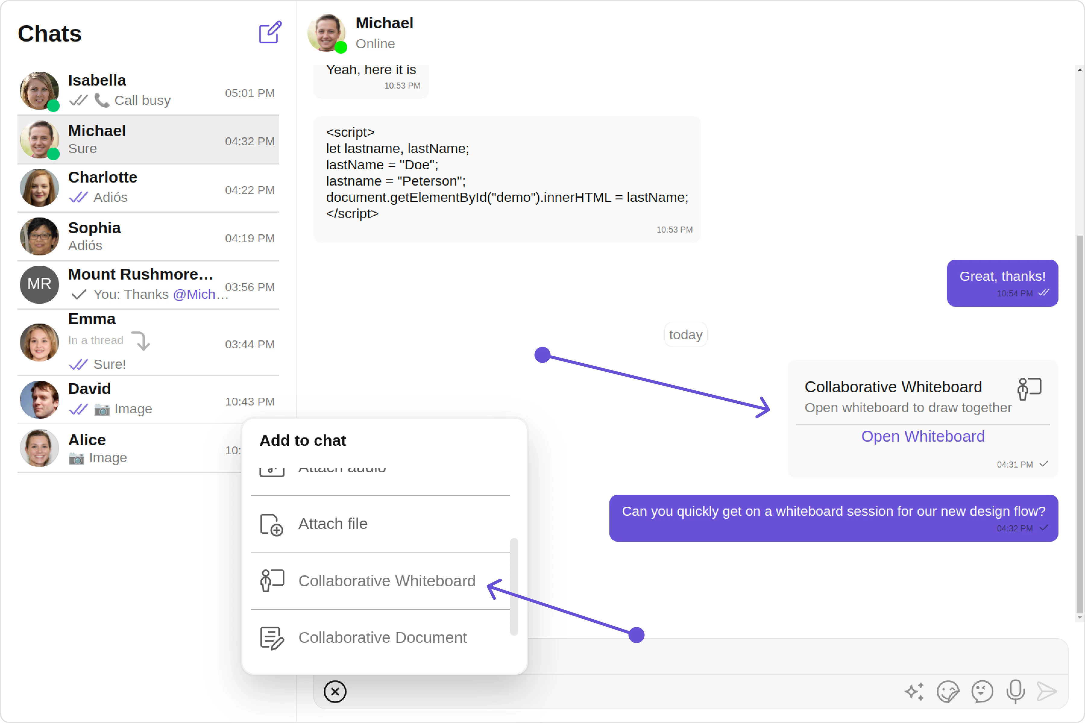 The Collaborative Whiteboard extension facilitates real-time collaboration. Users can draw, brainstorm, and share ideas on a shared digital whiteboard. For a comprehensive understanding and guide on implementing and using the Collaborative Whiteboard Extension, refer to our specific guide on the Collaborative Whiteboard Extension. Once you have successfully activated the Collaborative Whiteboard Extension from your CometChat Dashboard, the feature will automatically be incorporated into the Action Sheet of the Message Composer component of UI Kits.